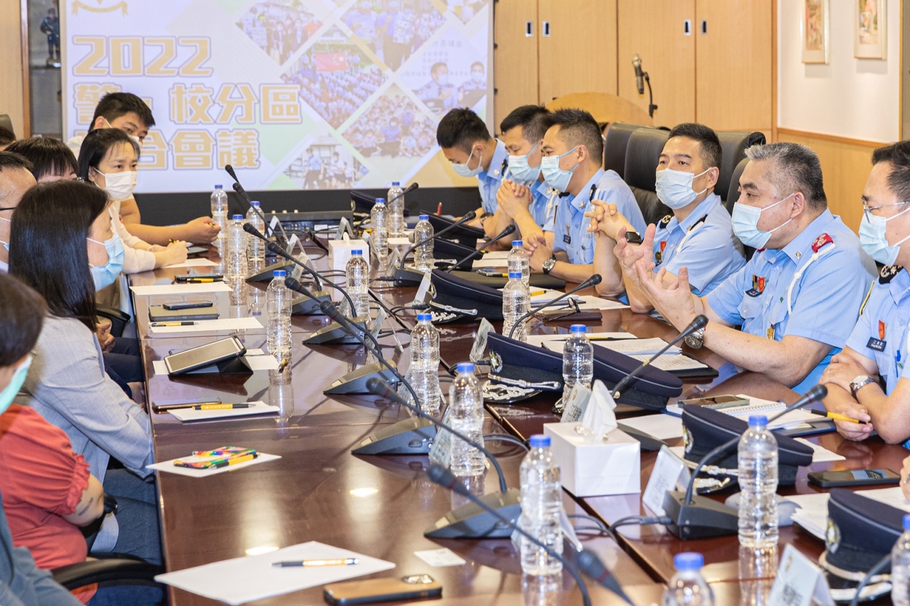 青年事務是治安警察局重點工作之一,本局透過建立「警‧校聯絡機制」(以下簡稱「機制」)與學校互通警情,共同推動及發展青年事務。為深化該機制的聯絡與合作,本局分別於5月16日至5月20日下午舉辦了「2022警‧校分區聯合會議」,邀請本澳69間非高等教育學校代表參與,共同探討「機制」的優化、校園周邊治安及交通情況,以及日後合辦各類有利青年學生身心健康活動等事宜。