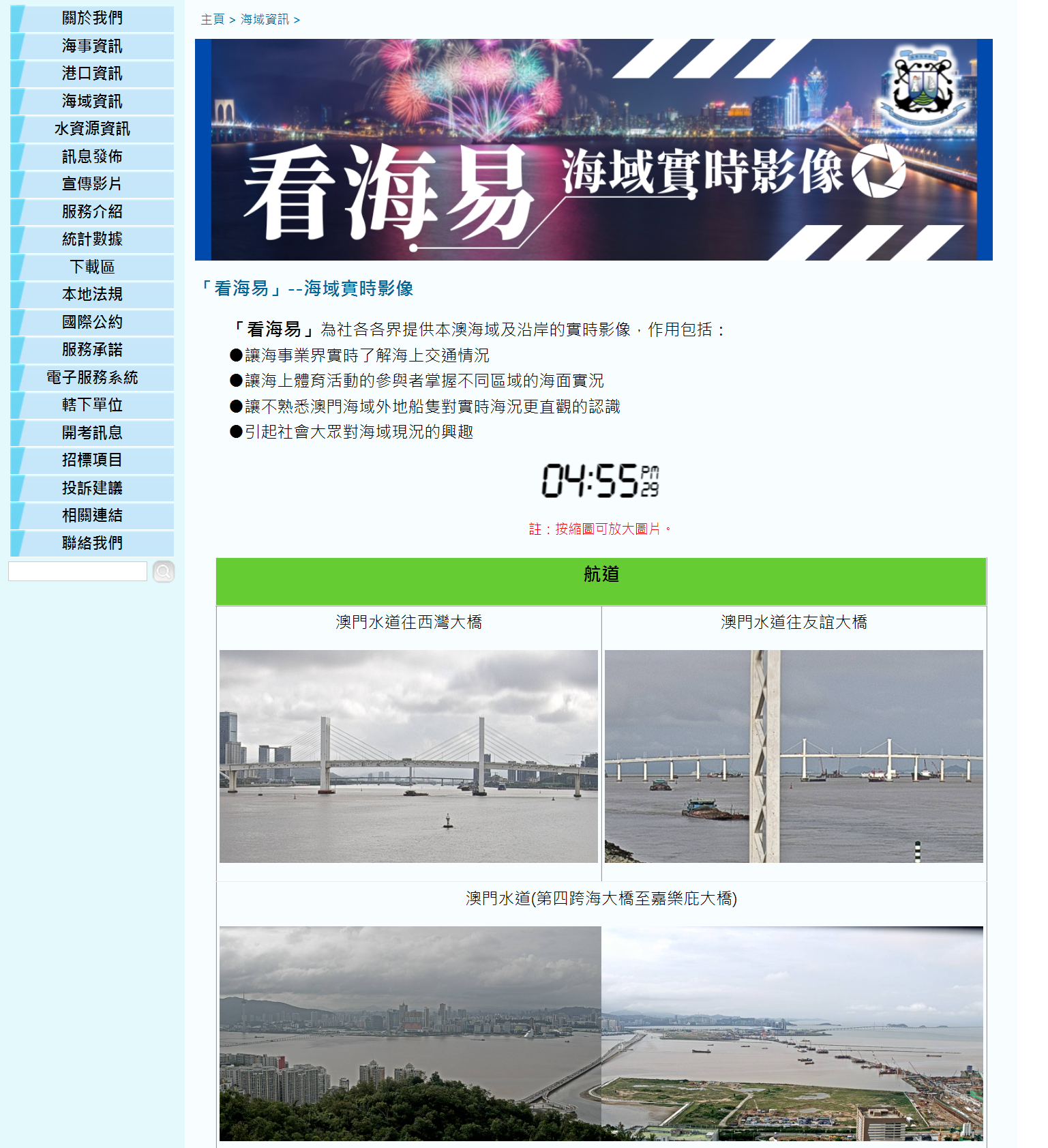 為方便社會大眾隨時了解澳門的海上交通情況,加深居民對澳門海域的了解,海事及水務局在原有海面實況頁面的基礎上,推出“看海易”項目,讓公眾和海事業界可隨時了解澳門水道、內港錨地等,繁忙海域的情況,也可從特別的角度觀看海面實況。