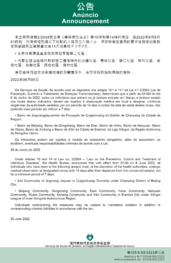 新型冠狀病毒感染應變協調中心(下稱應變協調中心)宣佈,因應內地的疫情變化,衛生局根據第2/2004號法律《傳染病防治法》第10條和第14條的規定,自2022年6月6日凌晨1時起,所有曾經到過以下地點的入境及已入境人士,須按照衛生當局的要求在指定地點接受醫學觀察至離開當地後14天但最短不少於7天: