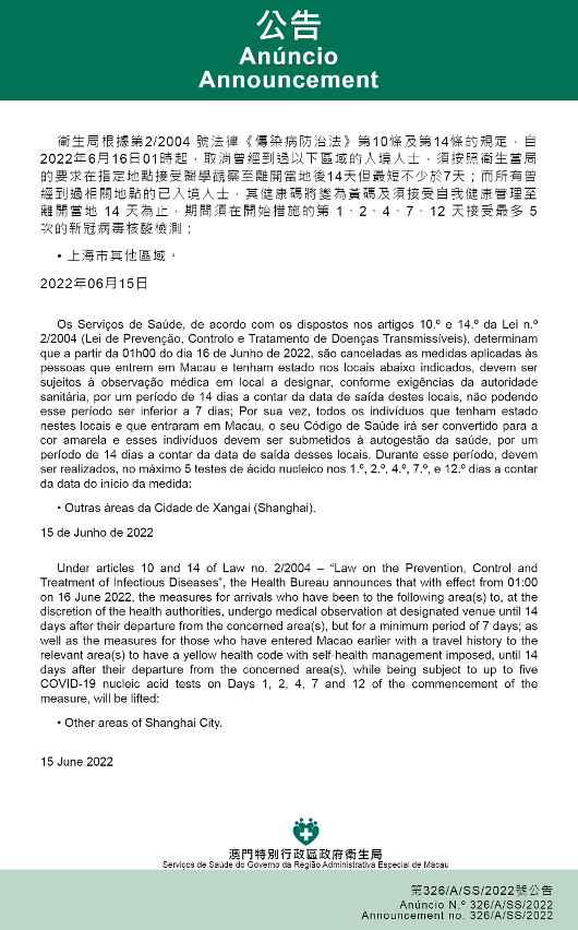 自2022年6月16日凌晨1時起,所有曾經到過以下區域的入境人士,須按照衛生當局的要求在指定地點接受醫學觀察至離開當地後10天,但最短不少於7天,並在離開當地後14天當天再接受1次新冠病毒核酸檢測結果為陰性後,才可經澳門前往中國內地;而所有曾經到過相關地點的已入境人士,其健康碼將變為黃碼及須接受自我健康管理至離開當地 14 天為止,期間須在開始措施的第 1、2、4、7、12天接受最多5次的新冠病毒核酸檢測:上海市閔行區莘莊鎮、浦江鎮、梅隴鎮的其他區域、顓橋鎮、古美路街道;浦東新區惠南鎮、花木街道、塘橋街道的其他區域、高橋鎮;靜安區曹家渡街道、天目西路街道、大寧路街道、共和新路街道、芷江西路街道的其他區域、臨汾路街道、寶山路街道、彭浦鎮;黃浦區瑞金二路街道其他區域、五里橋街道、打浦橋街道;徐匯區湖南路街道、天平路街道、田林街道、凌雲路街道的其他區域、龍華街道、斜土路街道、徐家匯街道、漕河涇街道;寶山區大場鎮、楊行鎮、高境鎮、張廟街道、淞南鎮、顧村鎮的其他區域,月浦鎮;虹口區江灣鎮街道、北外灘街道、歐陽路街道、四川北路街道、涼城新村街道的其他區域,嘉興路街道;楊浦區五角場街道其他區域、長海路街道、延吉新村街道、四平路街道;奉賢區南橋鎮其他區域;普陀區真如鎮街道;青浦區練塘鎮其他區域、徐涇鎮;崇明區新海鎮其他區域;松江區中山街道其他區域。