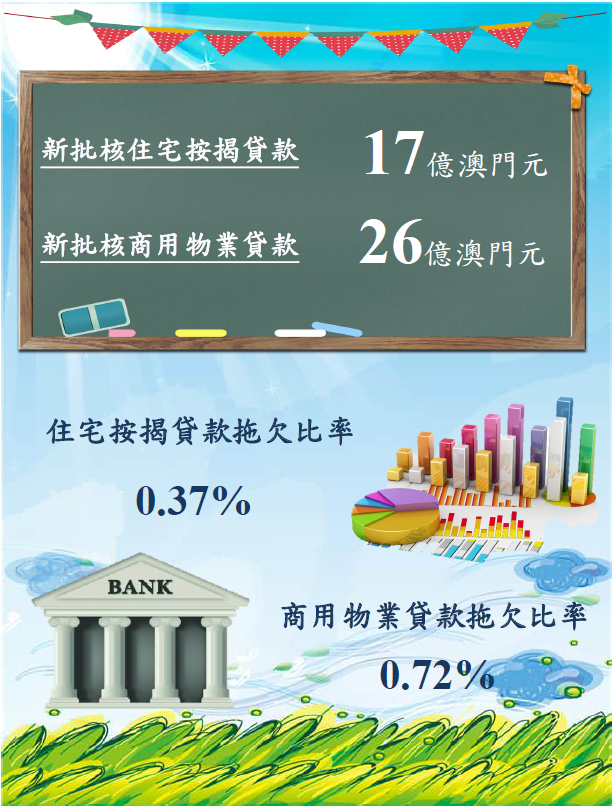 未償還商用物業貸款總額按月上升0.1%,與一年前比較亦上升0.8%,至1,603.4億澳門元;其中,居民部份佔93.5%。居民部份的未償還商用物業貸款按月基本持平,而非居民部份則上升1.9%。