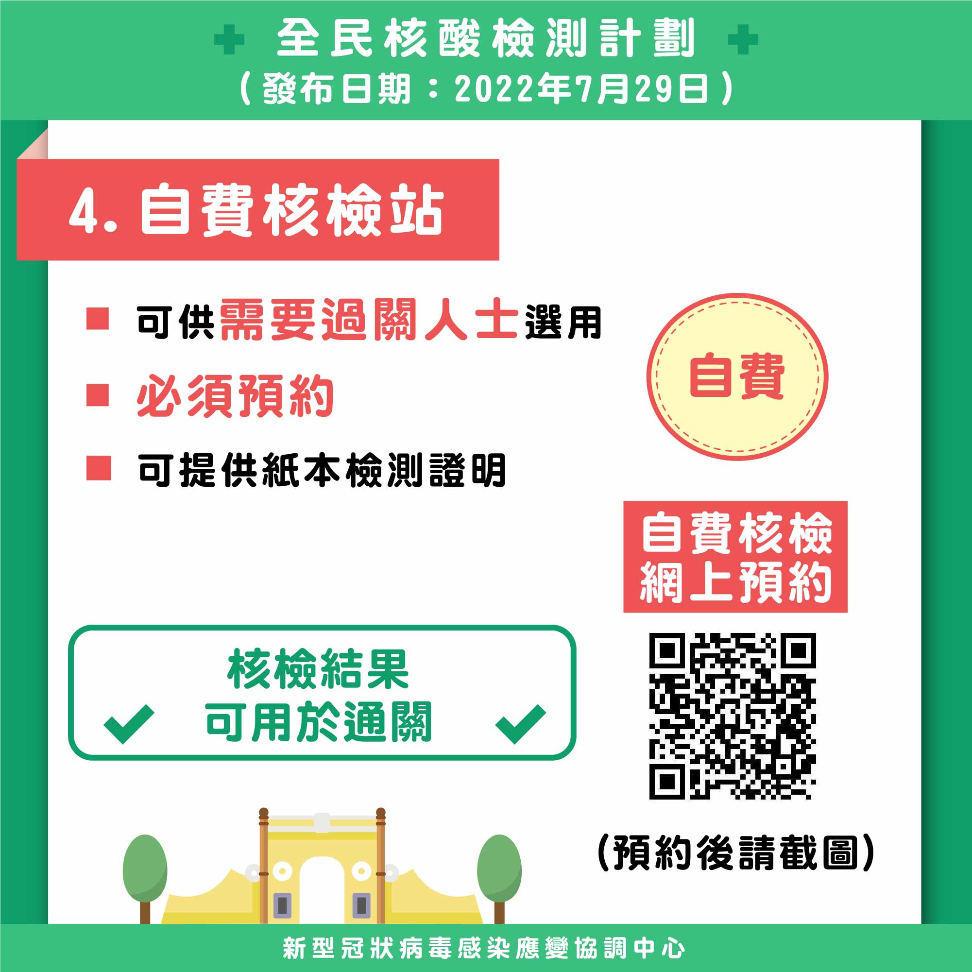 設2個自費核檢站(必須預約),預約連結為https://eservice.ssm.gov.mo/rnatestbook/V21/ 或https://app.ssm.gov.mo/kkhtbook。可提供紙本檢測證明,核檢結果可上澳門健康碼並用作通關,且可視為全民核檢結果。