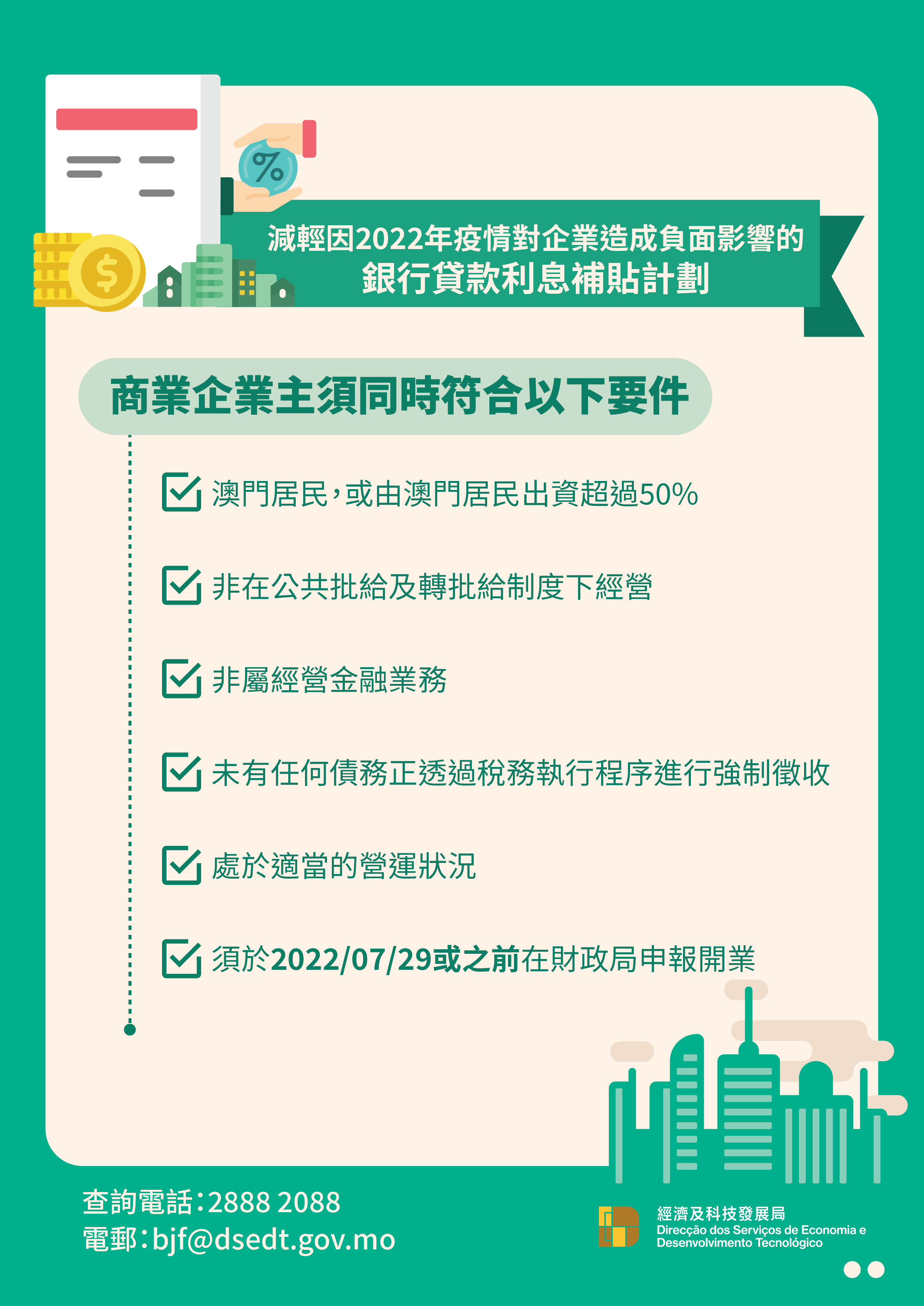申請資格方面,企業只要符合由澳門居民經營或控股超過50%,從事非公共批給業務或金融業務,且於2022年7月29日或之前已於財政局申報開業等條件,均可透過貸款銀行提出申請。