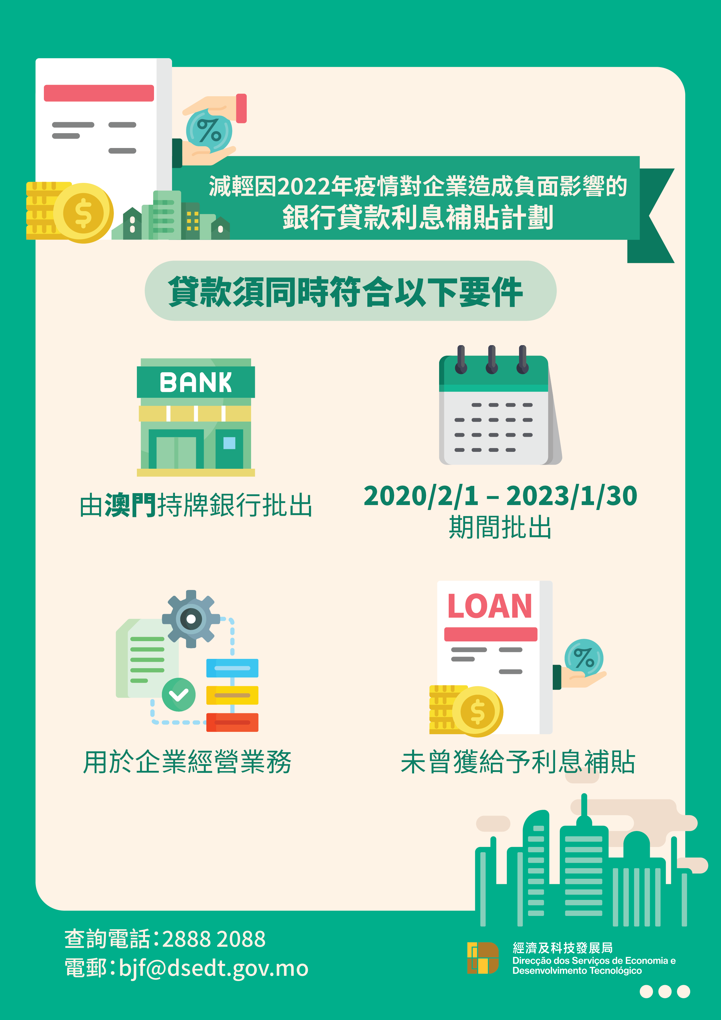 根據第35/2022號行政法規及第138/2022號行政長官批示,符合資格的企業,如於2020年2月1日至2023年1月30日期間,獲得澳門持牌銀行批准用於有關企業經營業務的貸款,可透過銀行申請相關利息補貼,貸款額上限為500萬元(澳門元,下同),補貼期最長為兩年,年補貼率上限為四厘。