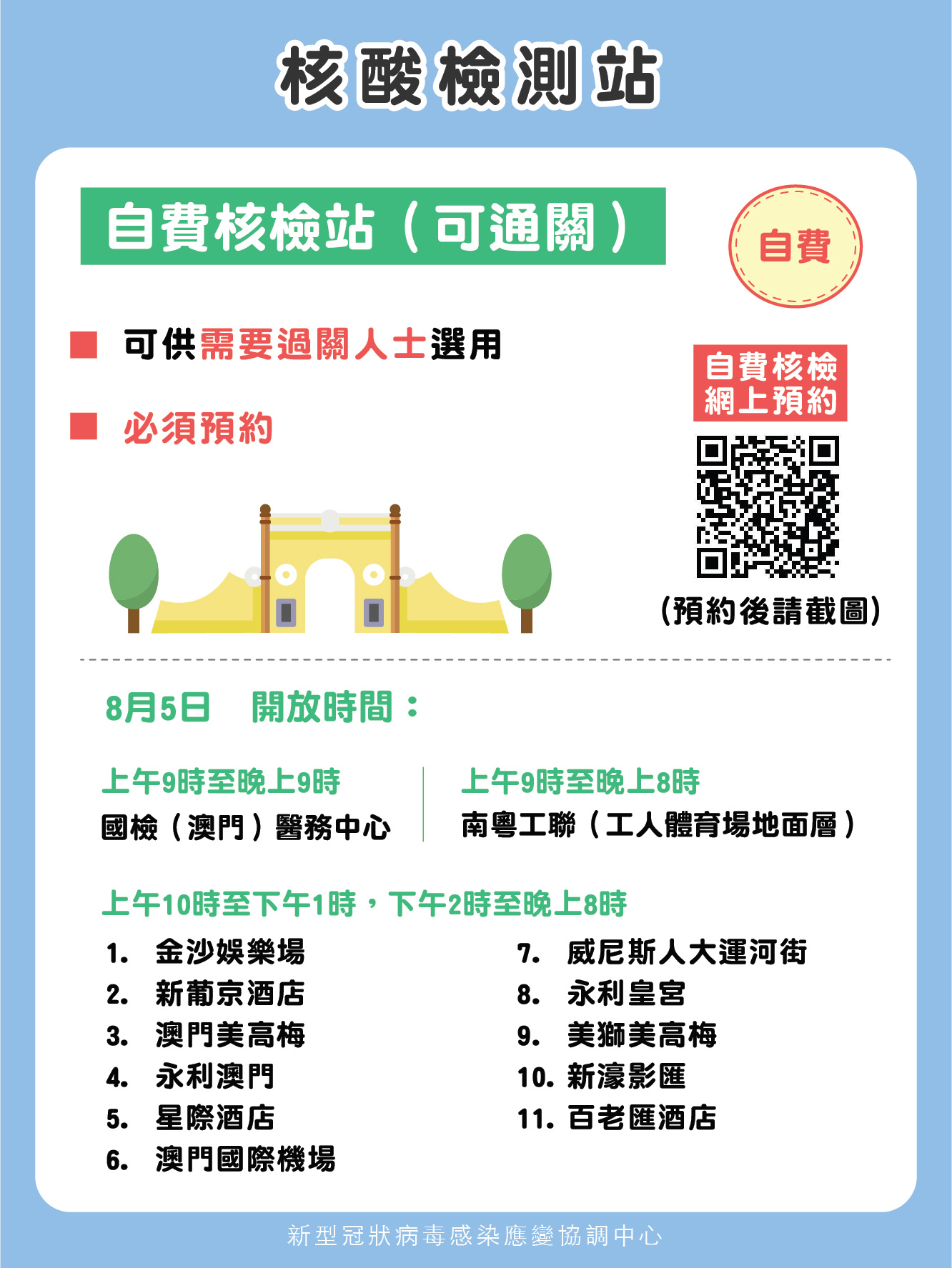 1. 免費核檢站預約連結為 https://eservice.ssm.gov.mo/allpeoplernatestbook,採樣和核檢結果可在澳門健康碼頁面顯示,但不可用作通關。