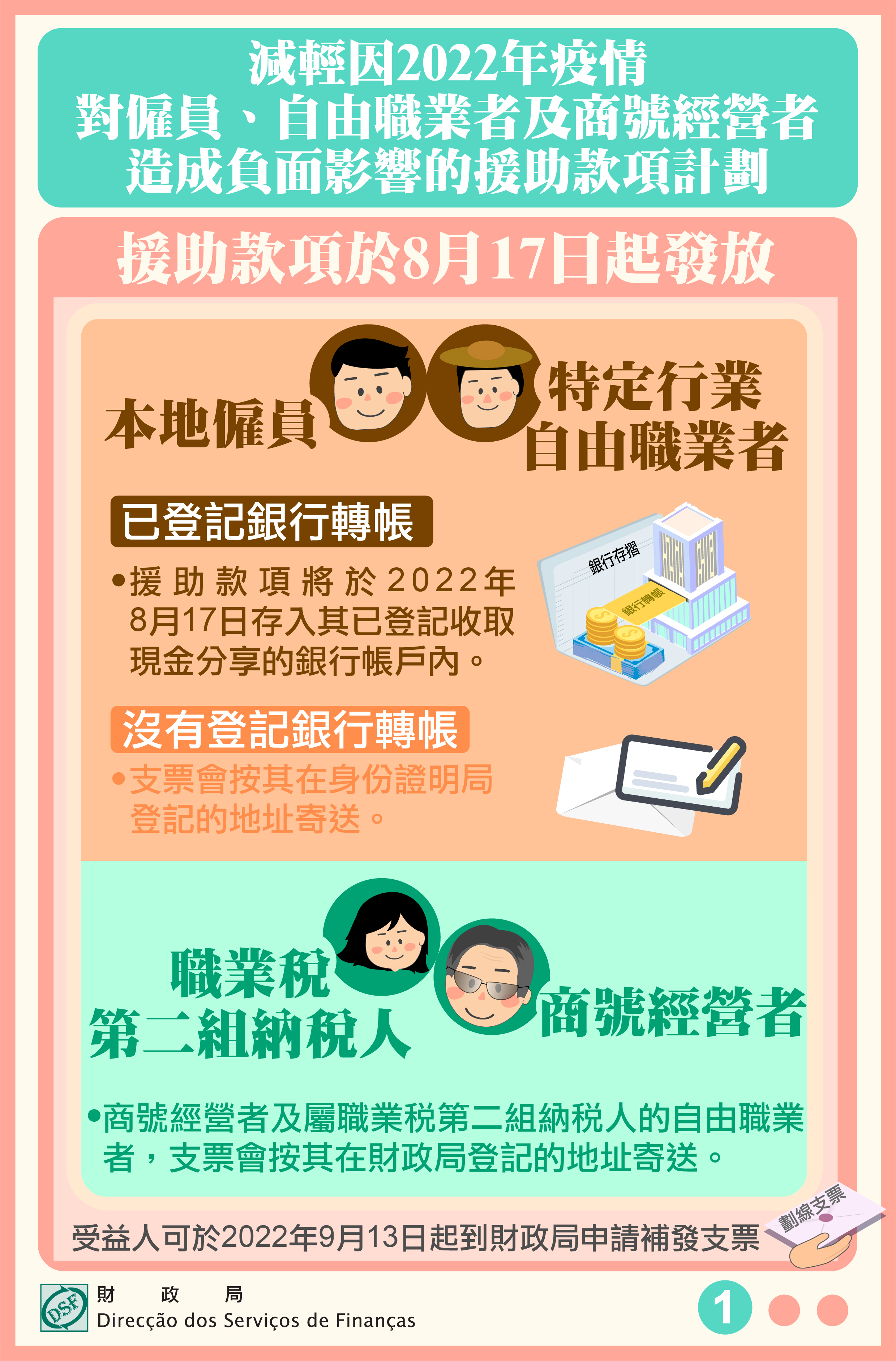 援助款項支票將於2022年8月17日起分批寄送。沒有登記銀行轉帳的僱員及特定行業自由職業者,支票會按其在身份證明局登記的地址寄送;商號經營者及屬職業稅第二組納稅人的自由職業者,支票會按其在財政局登記的地址寄送。受益人可於2022年9月13日起到財政局申請補發支票。