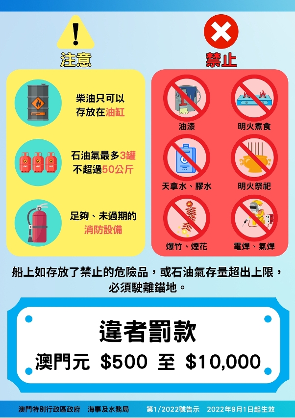 海事及水務局今(17)日刊登了第1/2022號《告示》,規定內港錨地停泊漁船的應遵規則,包括限制並排停泊的漁船數量、限制船上燃油的存放方式、訂定石油氣存量上限,禁止在停泊區內明火煮食、設立管制區以進行明火的祭祀活動和維修作業等。同時也要求船東須以電子方式向海事局申報漁船停泊的期間、燃油數量、石油氣和有否危險品等。有關《告示》將於九月起正式生效。