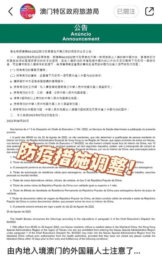 由2022年8月22日零時起,中國內地、香港特別行政區及台灣地區居民以外的非本地居民,可在遵守其他入境條件的前提下,無須獲得澳門衛生當局的事先批准而由中國內地入境澳門;旅遊局積極把握利好措施,持續加強宣傳。