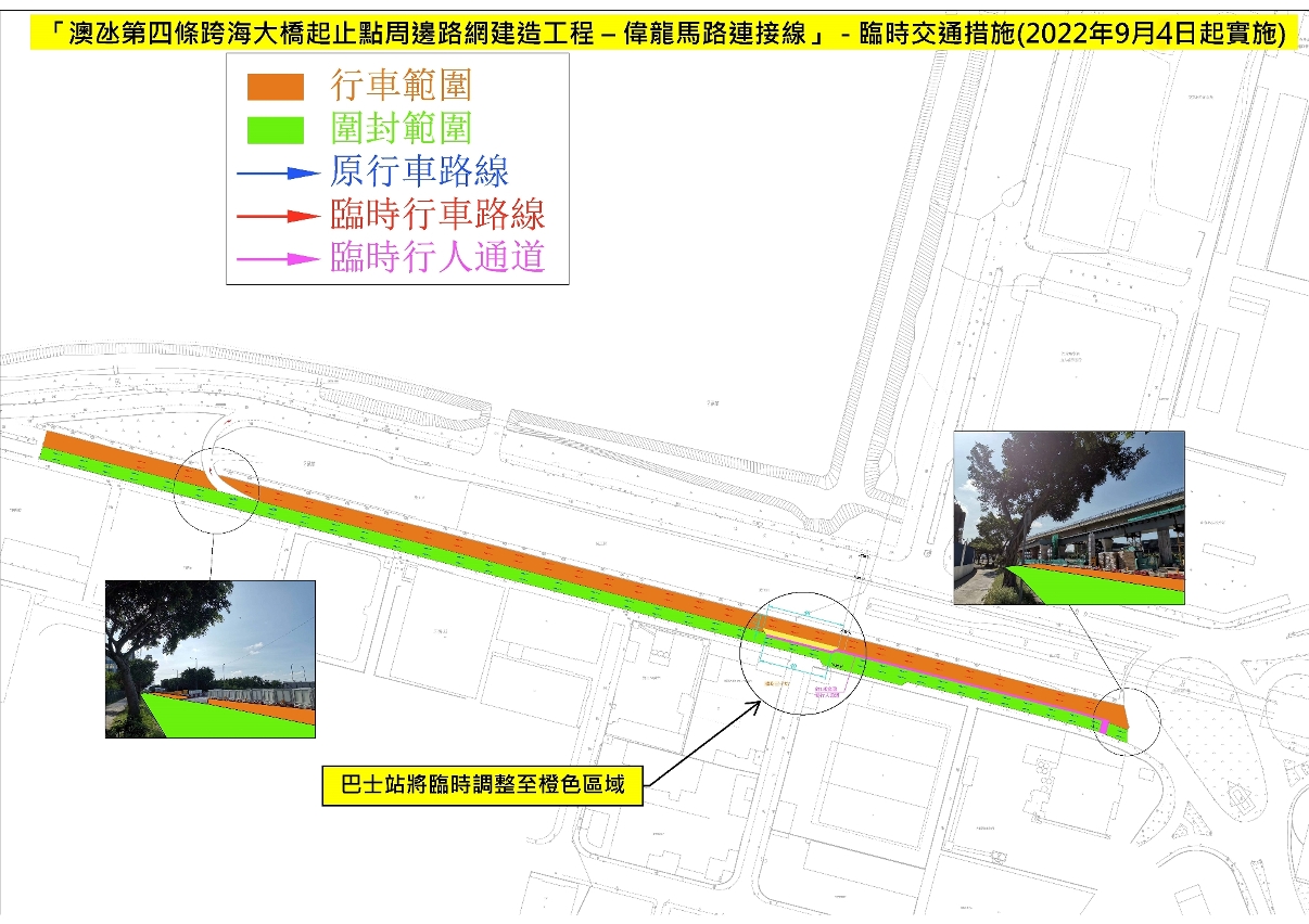 因應澳氹第四條跨海大橋起止點周邊路網建造工程-偉龍馬路連接線的推進,由2022年9月4日(周日)至2023年2月2日(周四),氹仔北安大馬路往友誼大橋方向的路段將實施有限度通車(詳見附圖)。