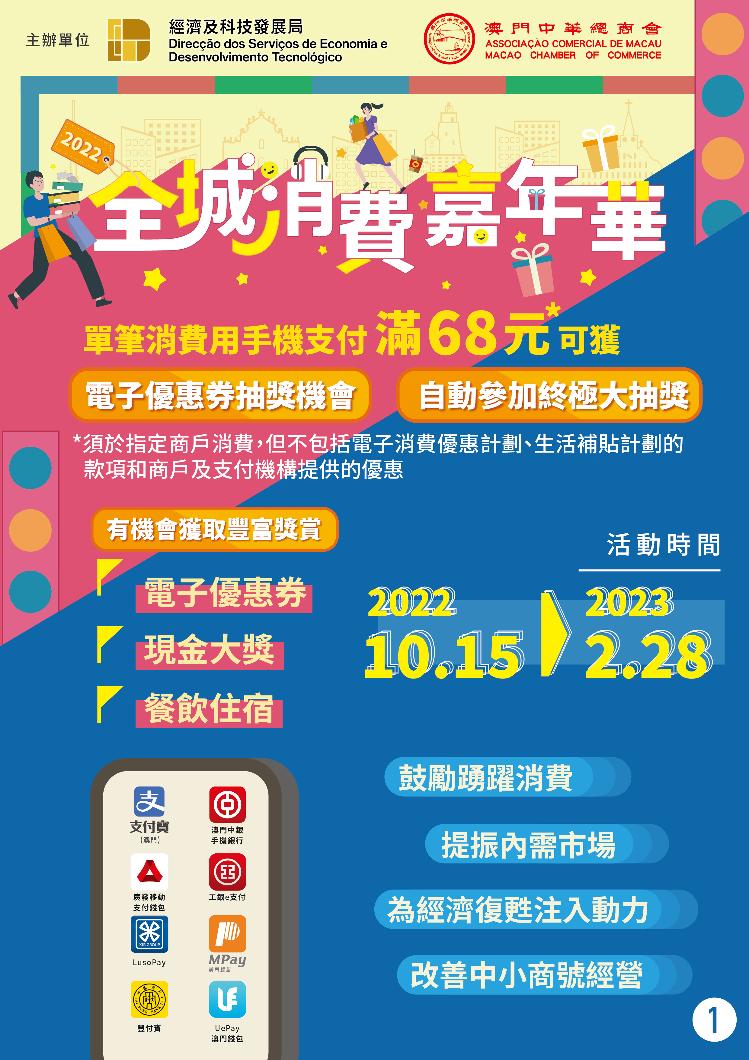 活動期間,通過實名認證的電子錢包用戶,於全澳線下大部分實體店舖消費時,透過移動支付單筆實付滿68元,即可獲得抽獎機會獲取電子優惠券,每筆消費最多可獲5次抽獎機會。