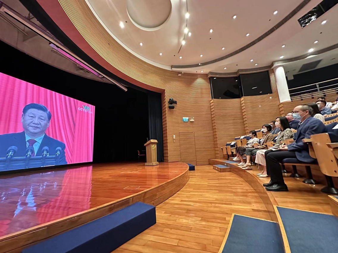 2022年10月16日上午,澳門旅遊學院黃竹君院長、呂劍英副院長、旅遊管理學校趙偉兵校長、酒店管理學校李頴詩代校長、持續教育學校林靜芝代校長、教務部林寶玉教務長、一眾課程主任和師生等於氹仔校區大禮堂共同觀看了中國共產黨第二十次全國人民代表大會的直播,認真學習了十九大以來我們國家和民族各項事業的發展情況以及未來的美好願景與工作部署。