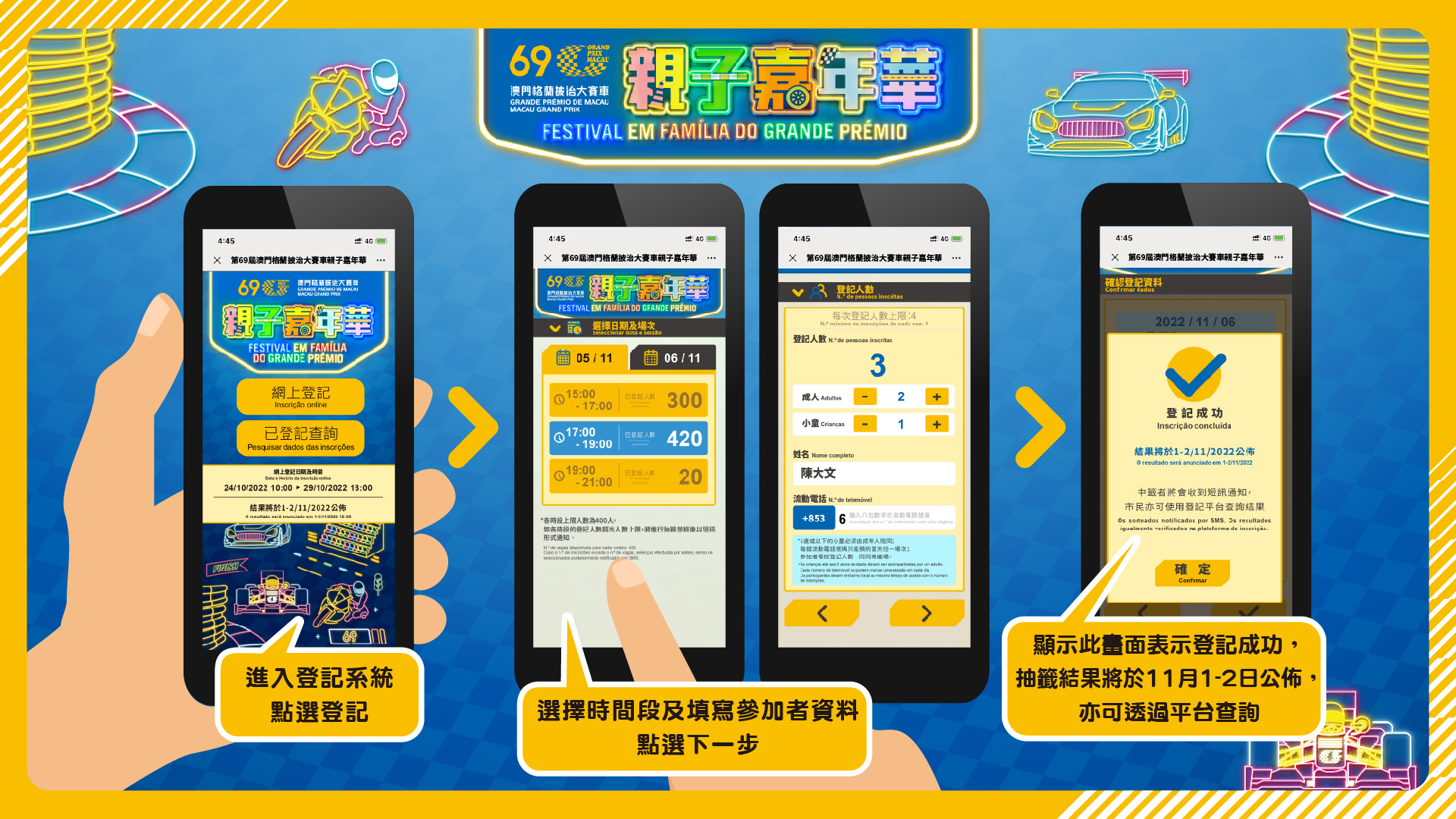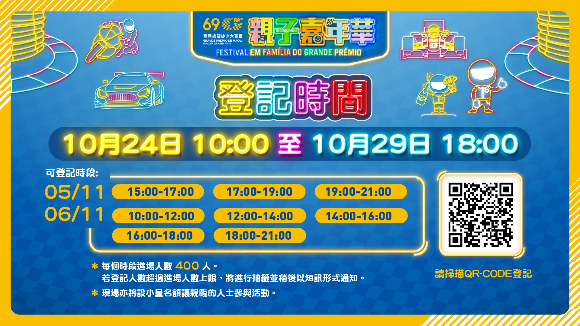其中親子嘉年華活動的概念是將塔石廣場模擬成為東望洋跑道及迷你賽車場,推出適合一家大細互動的遊戲,參與活動的小朋友可化身小賽車手及賽道上工作人員,生動地認識大賽車的各項工作及了解更多有關賽車活動的知識,而且有機會獲得大賽車精美紀念品。為了更好地安排人流,今年活動將採用網上登記的方式,每日會分不同的時段進場,11月5日分三個時段,分別為:15:00至17:00、17:00至19:00及19:00至21:00,11月6日分五個時段,分別為:10:00至12:00、12:00至14:00、14:00至16:00、16:00至18:00及18:00至21:00。進行網上登記的市民及旅客可於10月24日早上10時至10月29日下午6時,透過網址:https://www.macau-minigp.com/ 登入系統進行登記,每個時段進場人數400人,若登記人數超過進場人數上限,將進行抽籤,中籤者將於11月1日至2日收到短訊通知,市民及旅客亦可透過登記系統查詢抽籤結果;此外,現場亦將設小量名額讓親臨的人士參與活動。參加者需留意,每個流動電話號碼只可登記每個活動日其中一個場次,每次最多只能登記四人,而且必須同時進場,12歲以下小童必須由成人陪同參加。