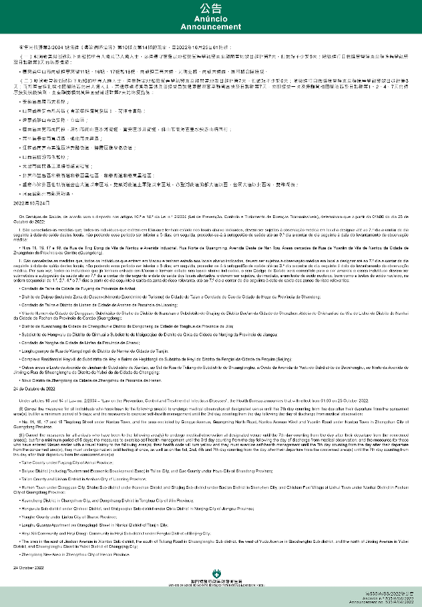 新型冠狀病毒感染應變協調中心(下稱應變協調中心)宣佈,因應內地的疫情變化,衛生局根據第2/2004號法律《傳染病防治法》第10條和第14條的規定,自2022年10月25日凌晨1時起,新增或取消對曾到內地相關區域人士的防疫措施: