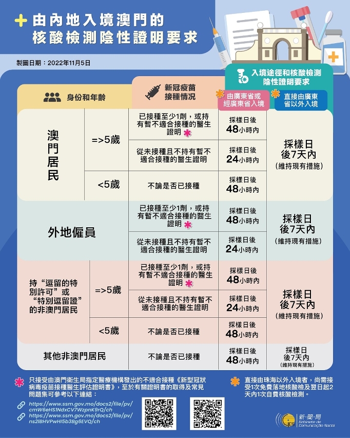 11月5日零時起調整由廣東省入境的特定人士核檢陰性證明要求 5歲或以上從未接種新冠疫苗的澳門居民、外地僱員、持有逗留特別許可或特別逗留證者須出示採樣日後24小時內核檢陰性證明