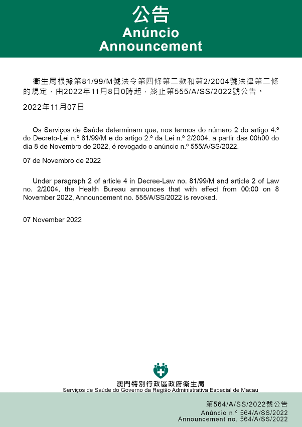 新型冠狀病毒感染應變協調中心(下稱應變協調中心)宣佈,衛生局根據第81/99/M號法令第四條第二款和第2/2004號法律第二條的規定,由2022年11月8日零時起,終止第555/A/SS/2022號公告。