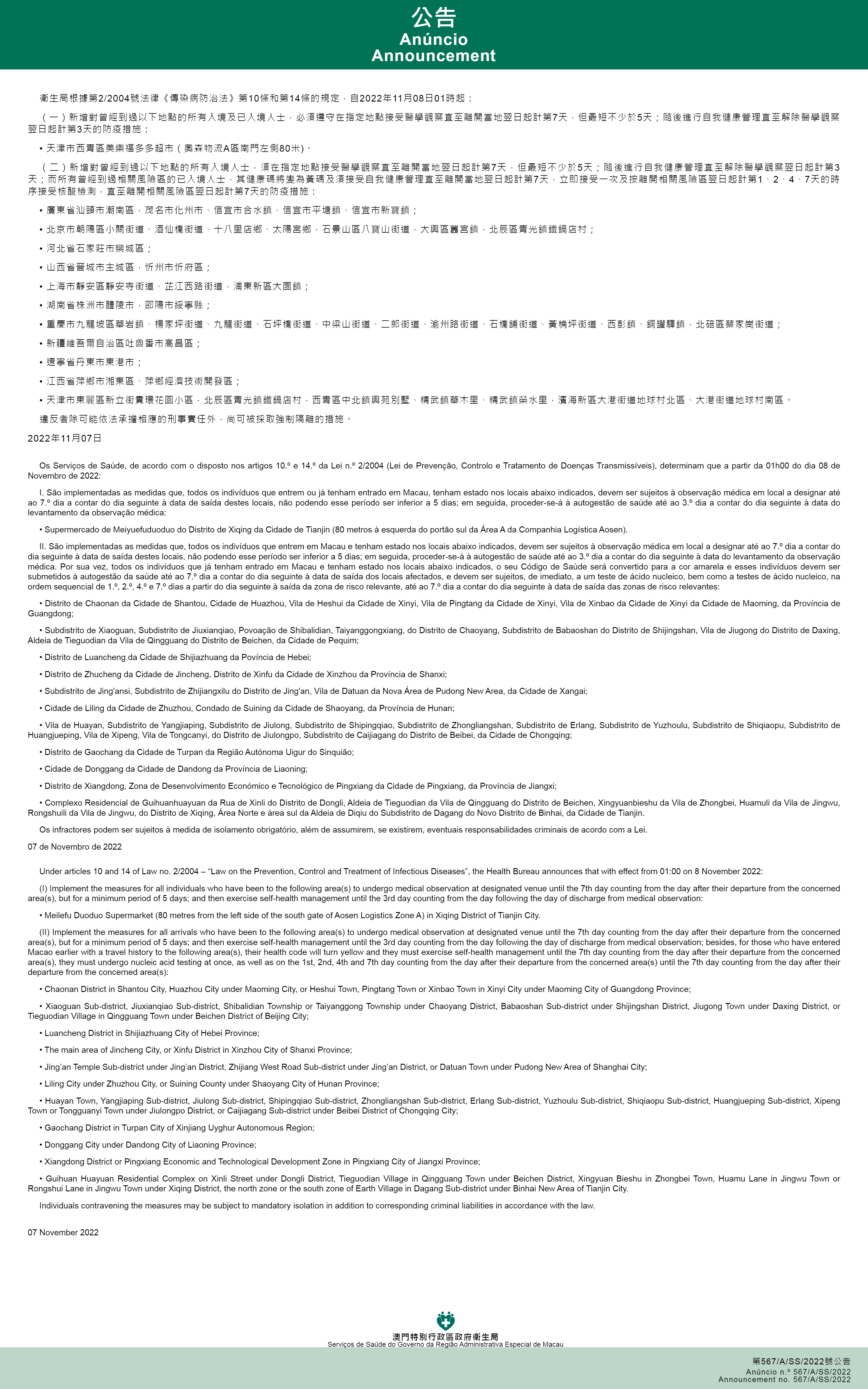 新型冠狀病毒感染應變協調中心(下稱應變協調中心)宣佈,因應內地的疫情變化,衛生局根據第2/2004號法律《傳染病防治法》第10條和第14條的規定,自2022年11月8日凌晨1時起,新增或取消對曾到內地相關區域人士的防疫措施: