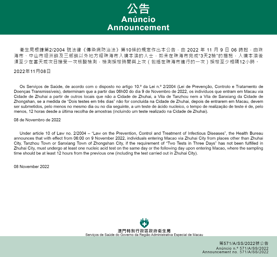 新型冠狀病毒感染應變協調中心(下稱應變協調中心)表示,因應內地各地疫情變化,為配合珠海市實施由外地到珠海市人士“3天2檢”的措施,由明(9)日上午6時起,由珠海市、中山市坦洲鎮及三鄉鎮以外地方經珠海市入境本澳的人士,如未在珠海市完成“3天2檢”的措施,入境本澳後須至少在當天或次日接受一次核酸檢測,檢測採樣時間與上次(包括在珠海市進行的一次)採樣至少相隔12小時。