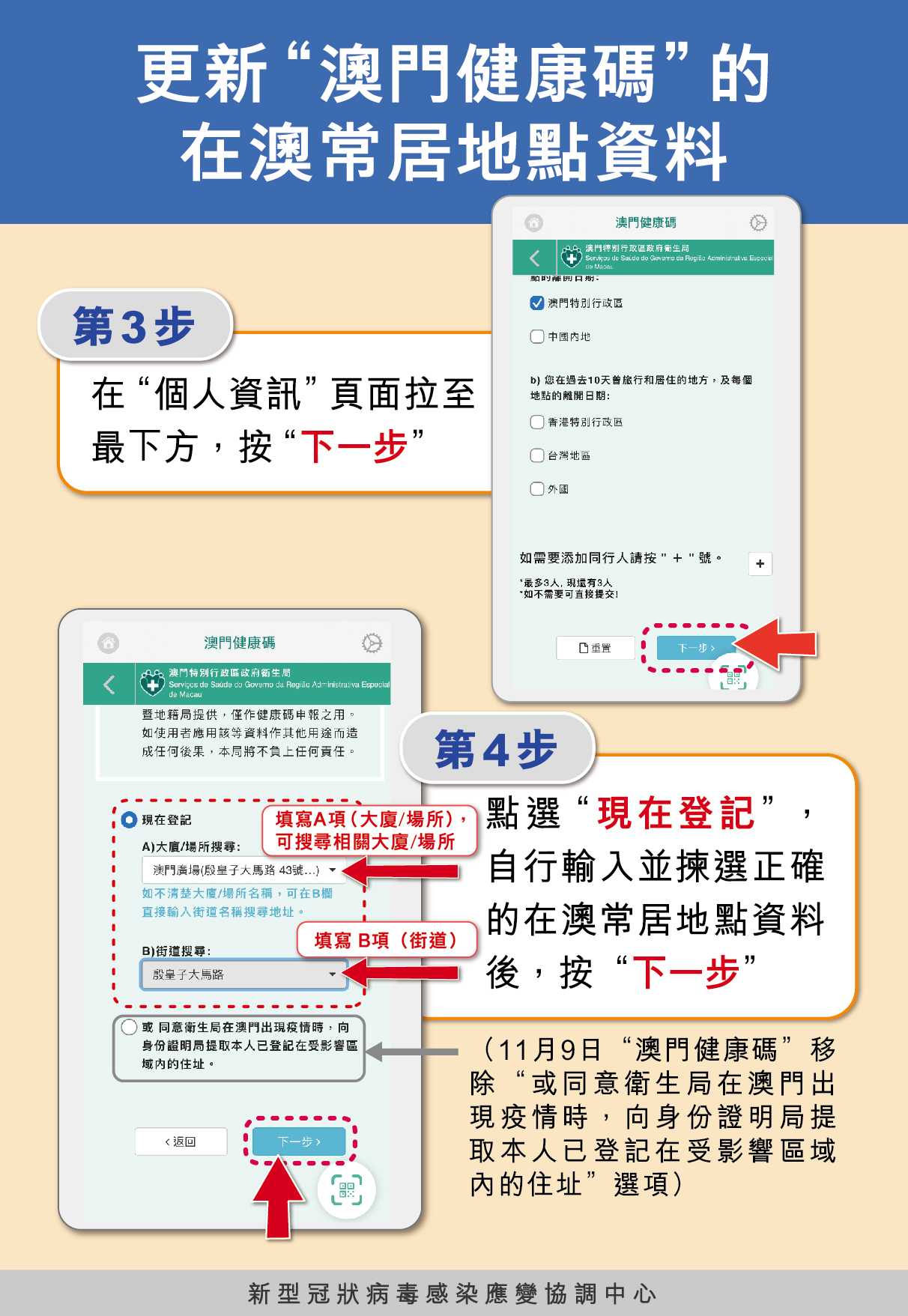 應變協調中心再次呼籲,為免因須重新填寫在澳常居地點資料,導致未能即時生成健康碼而引起不便,居民應預早檢視目前在澳常居地點資料,並可參閱以下圖文包完成地址更新;此外,社會工作局亦已於11月3日起在其轄下各社會工作中心為有需要人士提供更新及輸入在澳常居地點資料的協助。