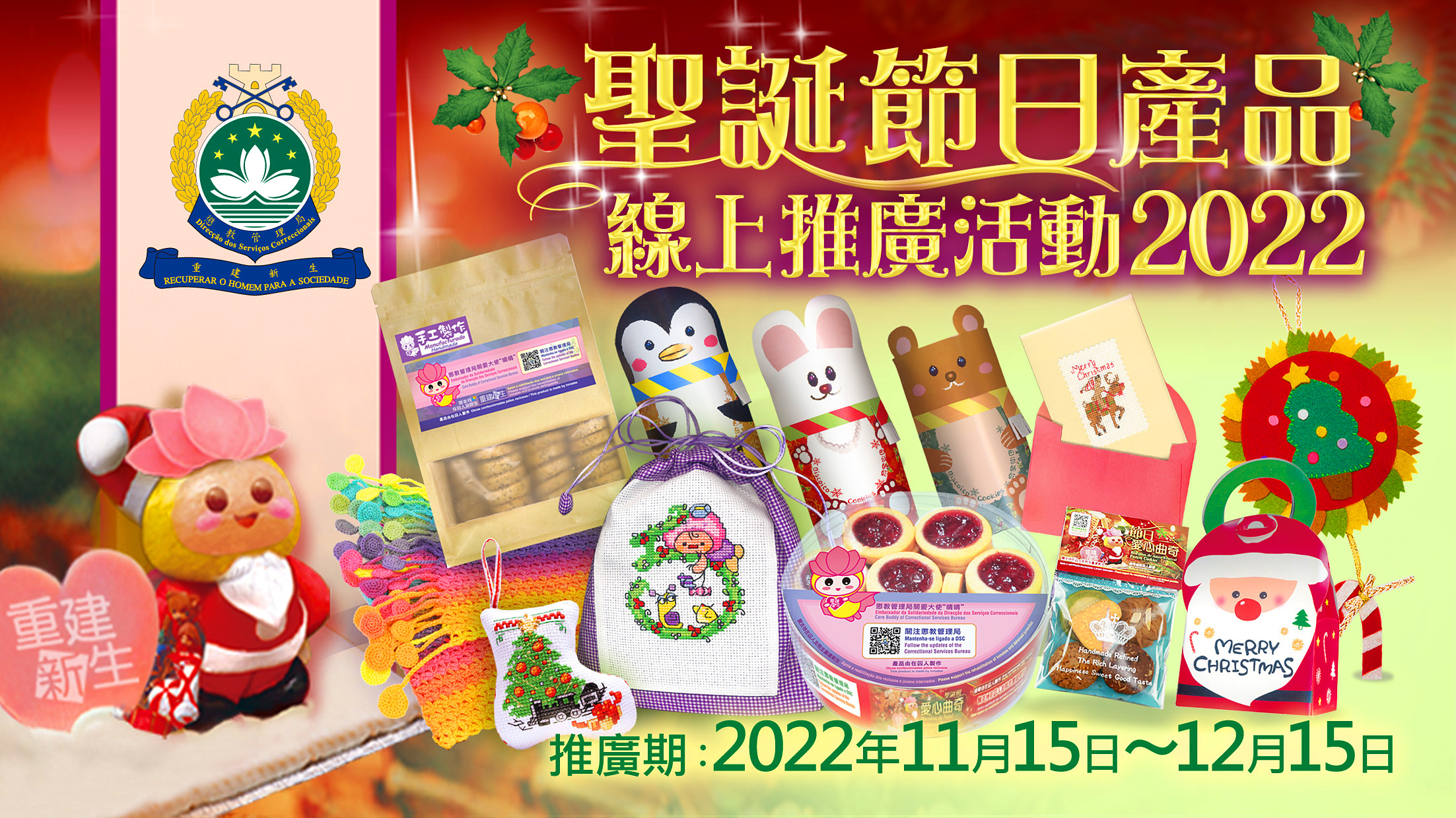 懲教管理局於11月15日至12月15日舉辦“在囚人及院生聖誕節日產品線上推廣活動”,活動旨在為在囚人及院生提供展示學習成果的平台,喚起社會大眾的關注,助力他們重建新生。市民可通過線上平台,欣賞和選購他們親手製作的聖誕節日產品。