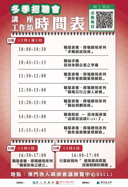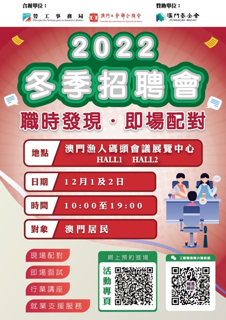 為配合衛生局防疫指引,避免造成過多人群聚集,有意參加招聘會或講座工作坊之人士可於網上登記,額滿即止。“冬季招聘會”連結為 https://www.dsal.gov.mo/zh_tw/standard/winter_jobfair_2022.html。