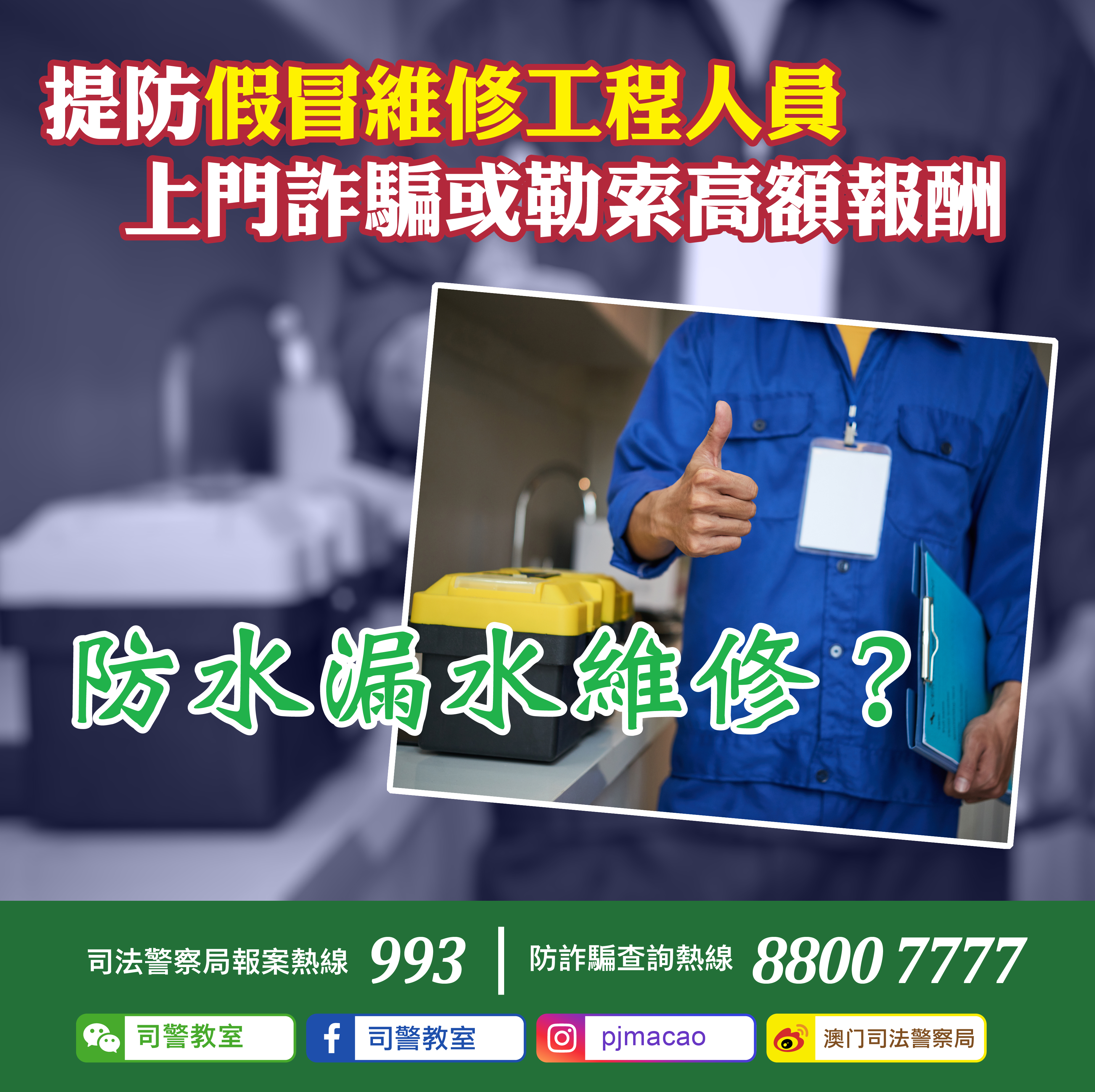 • 司警局呼籲市民提防假冒維修工程人員上門詐騙或勒索錢財
