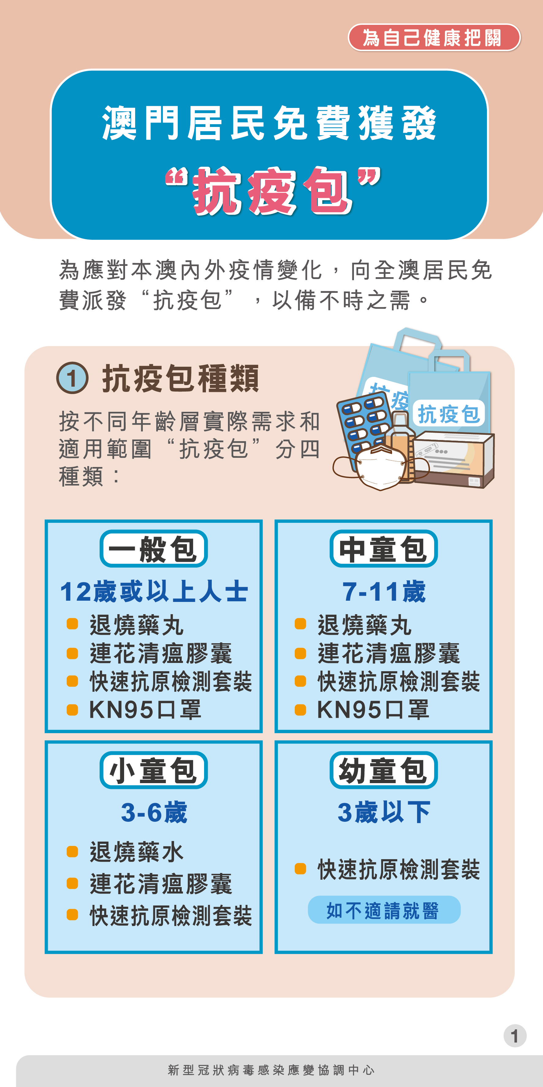 為應對本澳內外疫情變化,新型冠狀病毒感染應變協調中心(下稱應變協調中心)向全澳居民免費派發“抗疫包”,以備不時之需,並按不同年齡層的實際需求和適用範圍分四個種類。