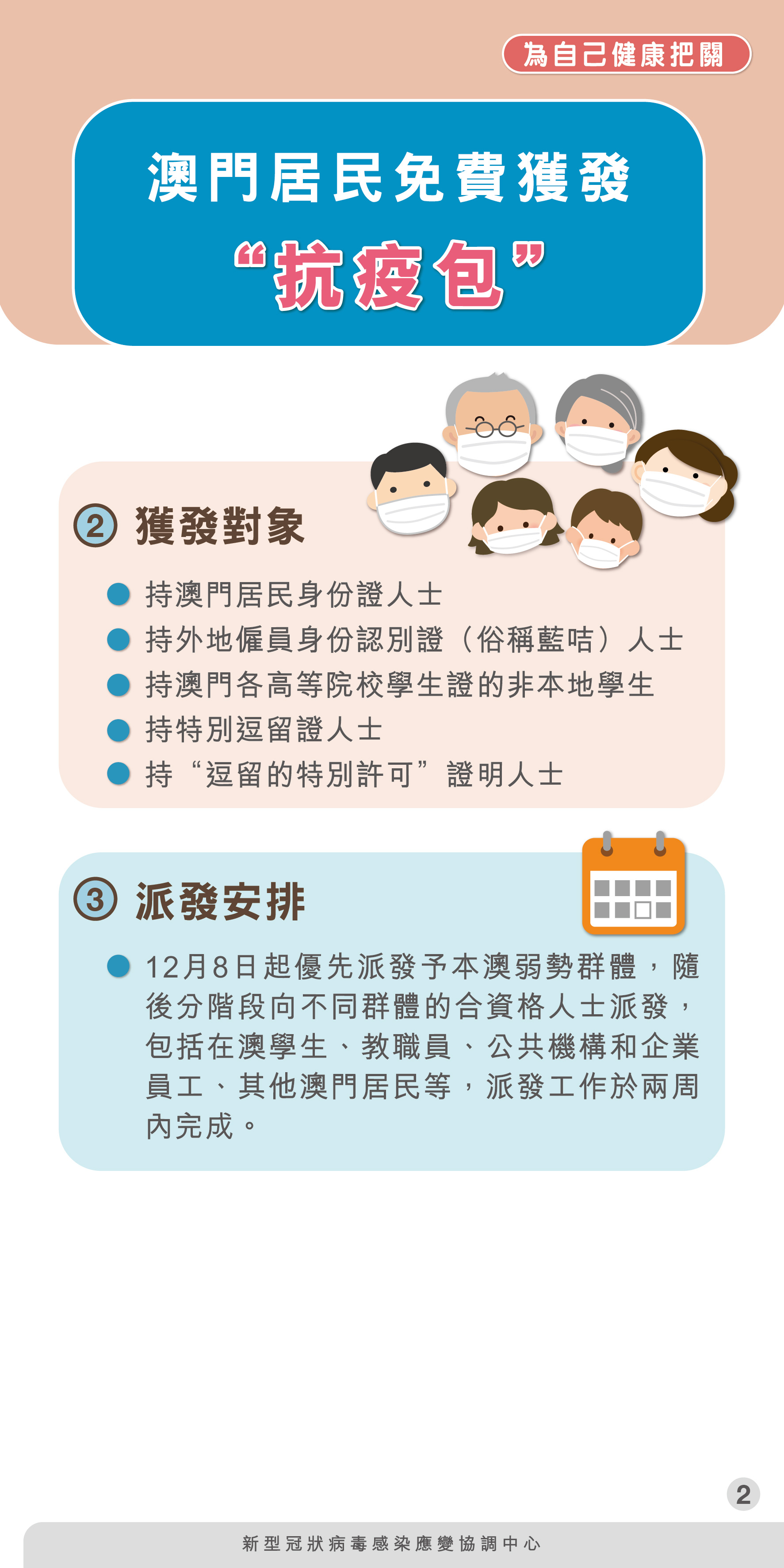 應變協調中心表示,首階段優先派發予本澳弱勢群體,由社會工作局協調有關機構於12月8日(星期四)起發放抗疫包予兒青院舍、長者院舍(資助及非資助)、長者日間設施、康復院舍、戒毒綜合服務設施、社會重返設施,及托兒所(資助及非資助),有關人士毋須自行前往領取。除首階段優先派發予本澳上述弱勢群體外,隨後分階段向不同群體的合資格人士派發,包括在澳學生、教職員、公共機構和企業員工、其他澳門居民等,派發工作於兩周內完成,稍後亦會提供上述藥物中、西醫生的專業用藥指導短片供居民參考。
