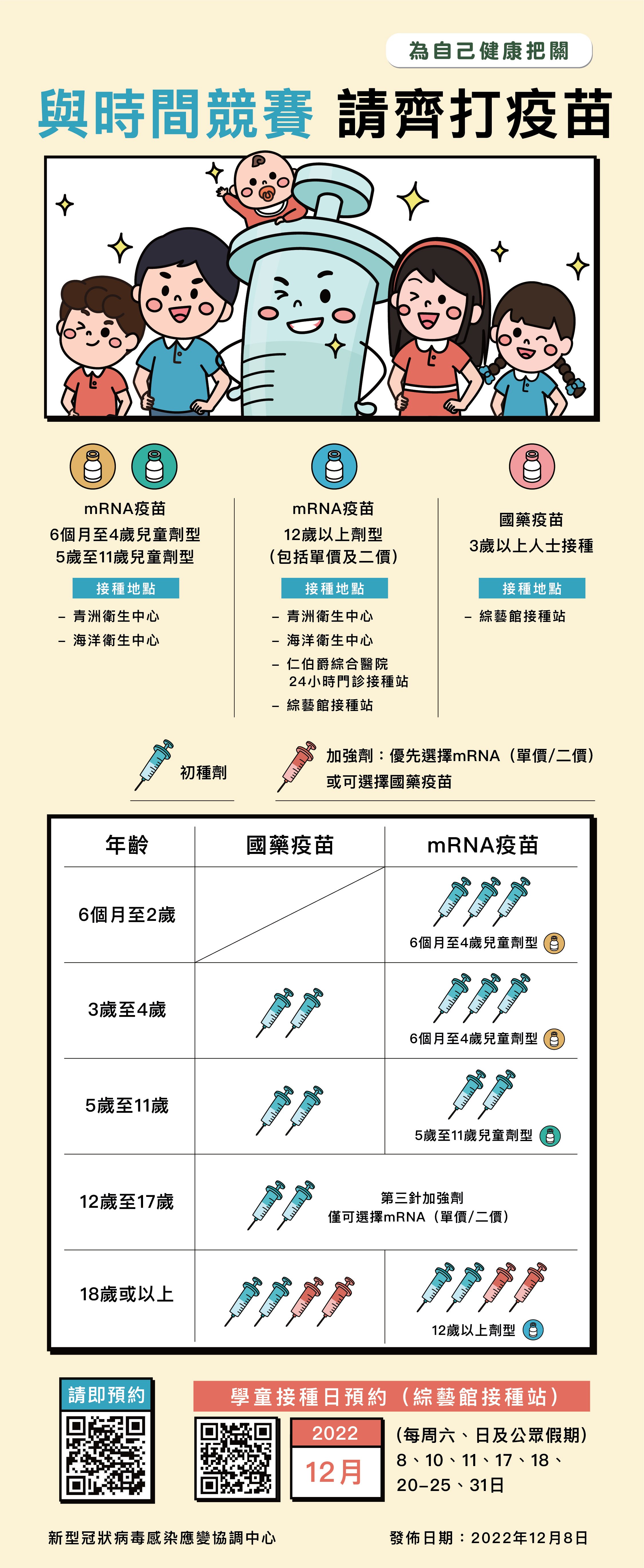 為應對新冠肺炎疫情的變化,為自己健康把關,與時間競賽,接種新冠疫苗刻不容緩。教育及青年發展局及衛生局持續推動學童接種新冠疫苗,務求可降低重症及死亡風險,透過外展入校接種、組織到社區專場,以及每周末及節假日在綜藝館社區大型疫苗接種站舉辦的“學童接種日”,便利家長儘快為已入學而未接種新冠疫苗的子女接種。