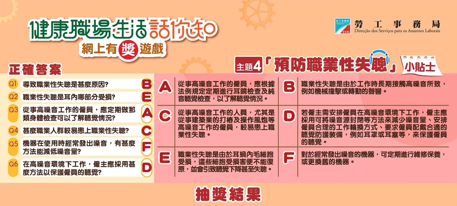 其中,最後一期以預防職業性失聰為主題的問答遊戲已於11月20日結束。是次活動反應熱烈,共有7,714人次參加,當中有7,457人次答對全部問題。勞工事務局在11月29日舉行第四期遊戲抽獎及終極大抽獎儀式,由勞工局領導及主管抽出得獎者。第四期遊戲的30名得獎者,各可獲得面值100元超市禮券一張,有關得獎者將獲電話短訊通知;同場亦進行了終極大抽獎儀式,凡完成並答對當中三期遊戲全部問題的參加者,即可自動參加本次終極大抽獎,抽出的5位得獎者,最高可獲澳門元3,000元獎金,得獎者將有專人聯絡有關領獎的事宜。
