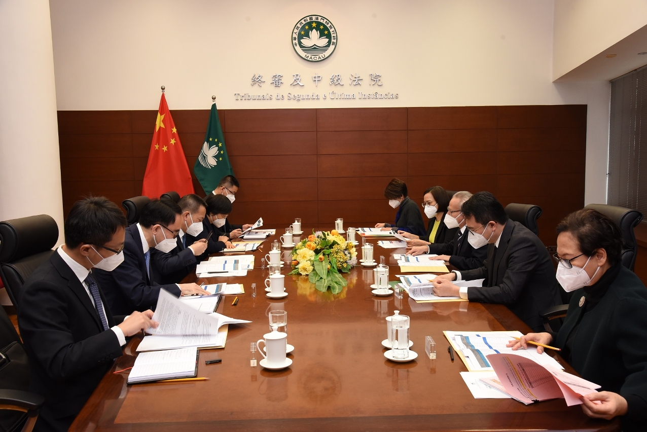 2022年12月13日上午,中央人民政府駐澳門特別行政區聯絡辦公室副主任黃柳權率中聯辦法律部部長李雪飛、副部長王恆和處長高真,禮節性到訪終審法院。