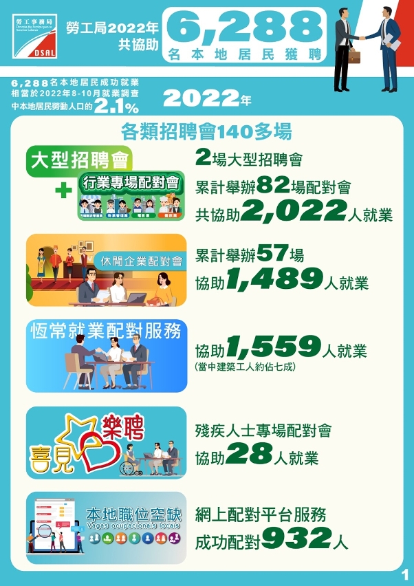 2022年全年,各項線上線下就業配對服務共成功協助6,288名本地居民成功就業,相當於2022年8至10月就業調查中本地居民勞動人口的2.1%。
