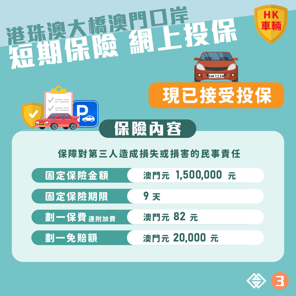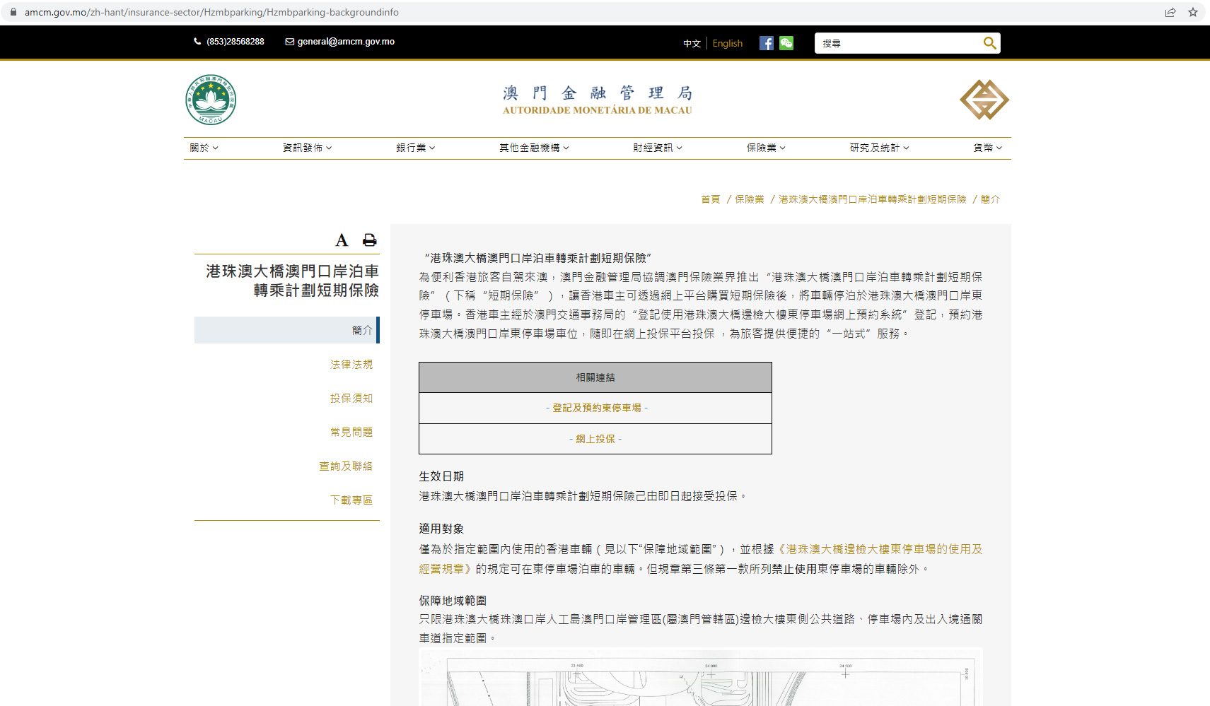為便利香港旅客自駕來澳,澳門金融管理局協調澳門保險業界推出“港珠澳大橋澳門口岸泊車轉乘計劃短期保險”(下稱“短期保險”),讓香港車主可透過網上平台購買短期保險後,將車輛停泊於港珠澳大橋澳門口岸東停車場。