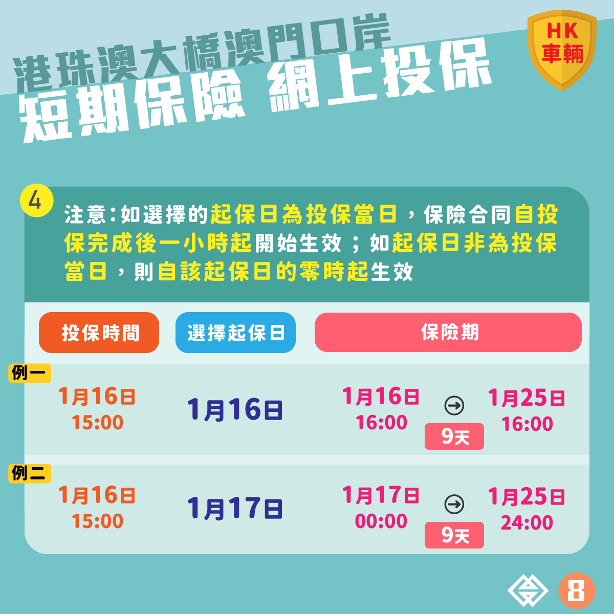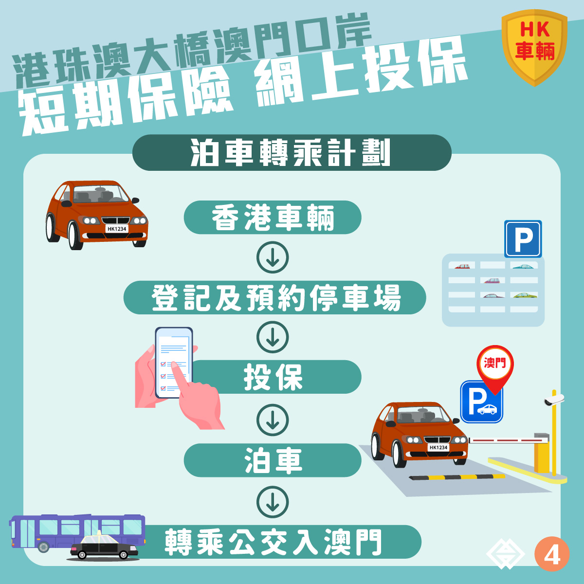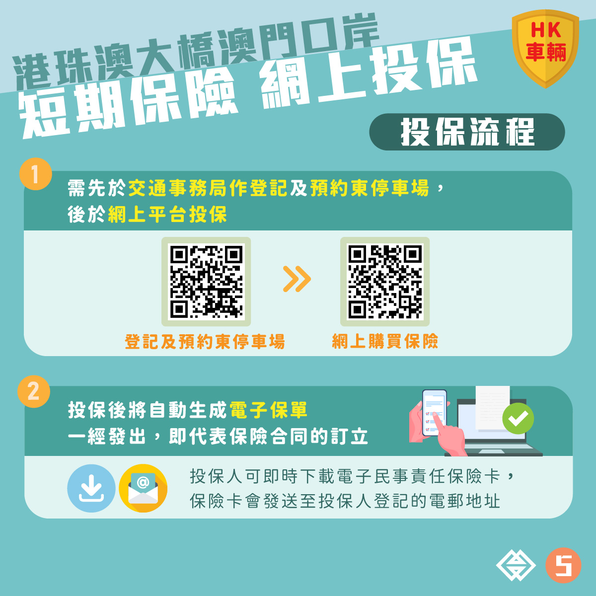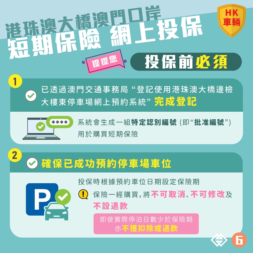香港車主透過澳門交通事務局的“登記使用港珠澳大橋邊檢大樓東停車場 - 網上預約系統”完成登記,並成功預約港珠澳大橋澳門口岸東停車場泊位後,便可透過系統自動轉駁至投保平台,向參與計劃的澳門保險公司購買為期9日的短期保險。投保平台於2022年12月30日下午6時起開通。