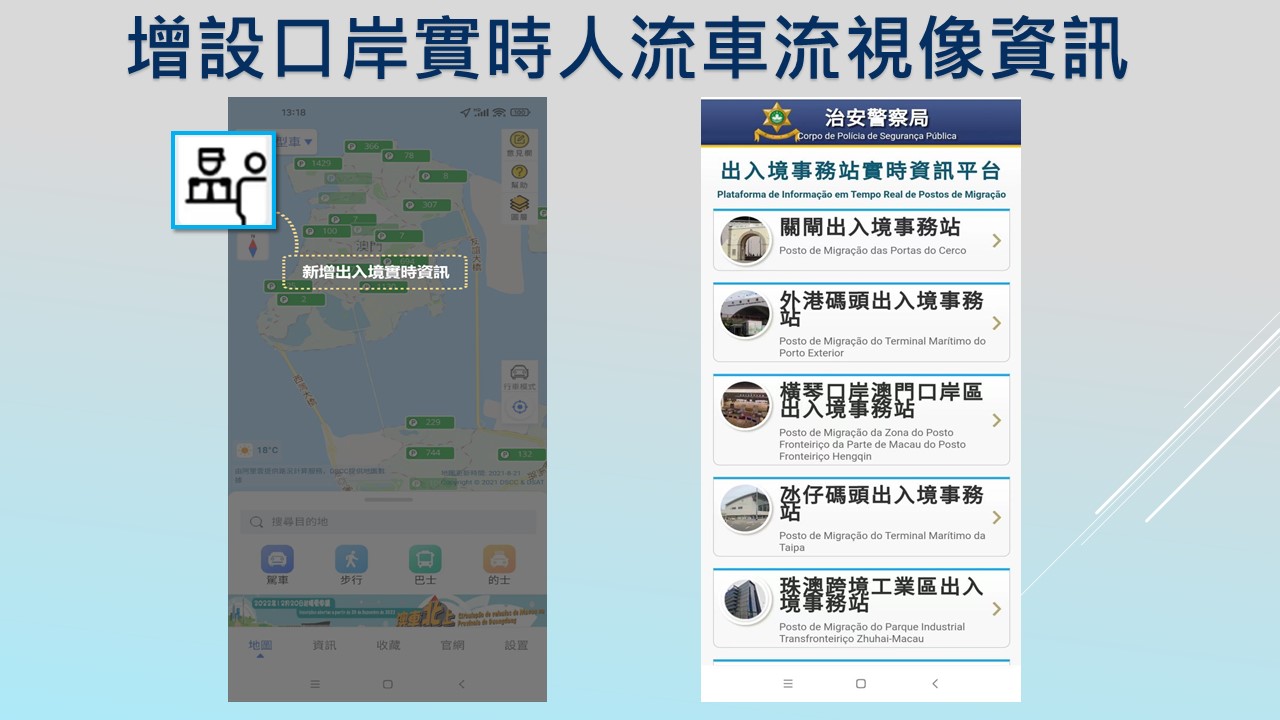 為繼續推動智慧交通之發展,交通事務局持續優化澳門出行APP,新版增設路面及口岸視像資訊,讓市民以視像方式瞭解路面及口岸情況,以更好地規劃行程,相關APP的更新版已上載到iOS及Google應用商店,歡迎市民免費下載使用。