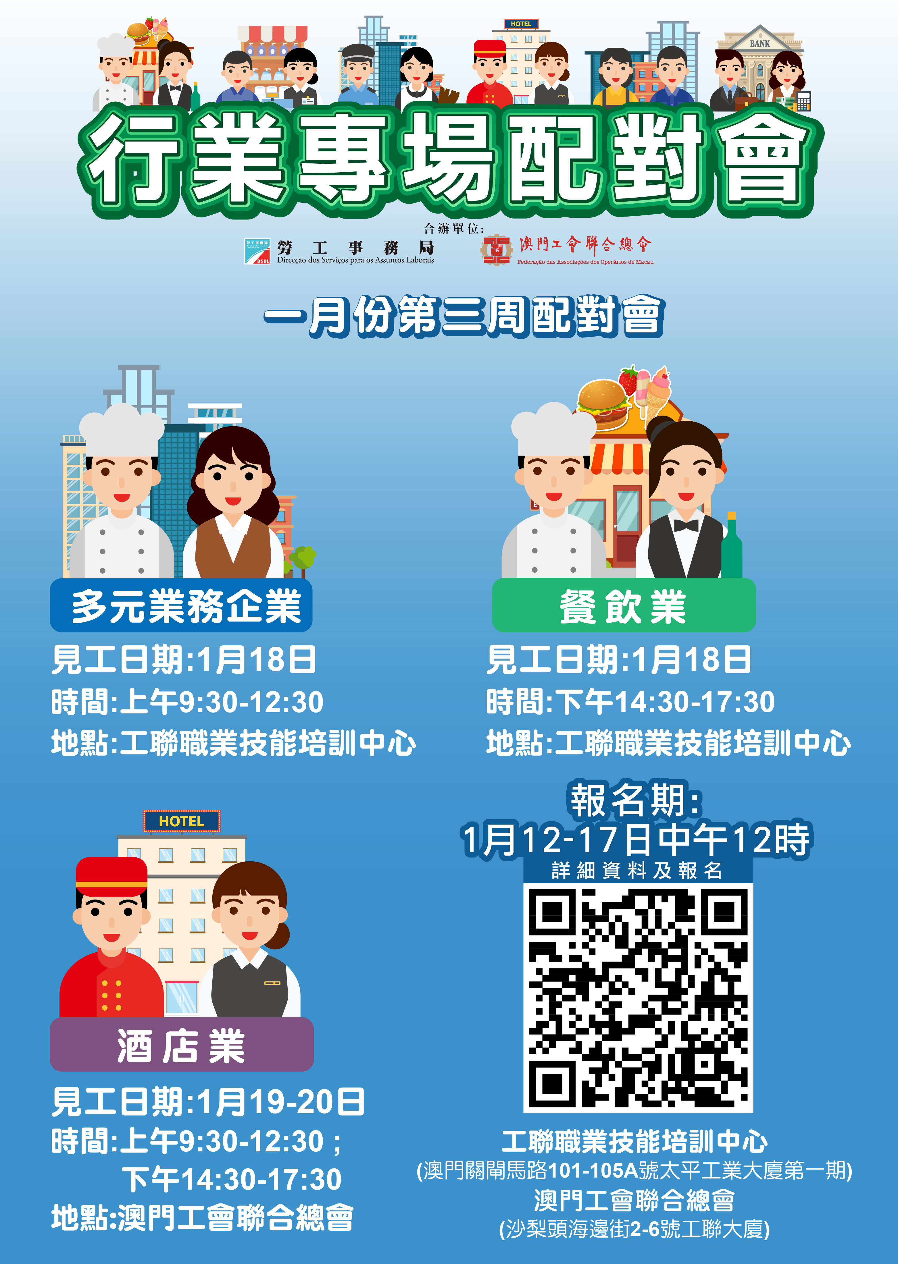 隨著澳門入境措施的放寬,有利旅客來澳旅遊,餐飲、零售及酒店餐飲和房務相關人資需求有所增加,為協助業界招聘人手,勞工局持續與工聯合作,於1月18日至20日一連3日舉辦4場行業專場配對會,合共推出353個空缺,可於1月12日起網上報名。
