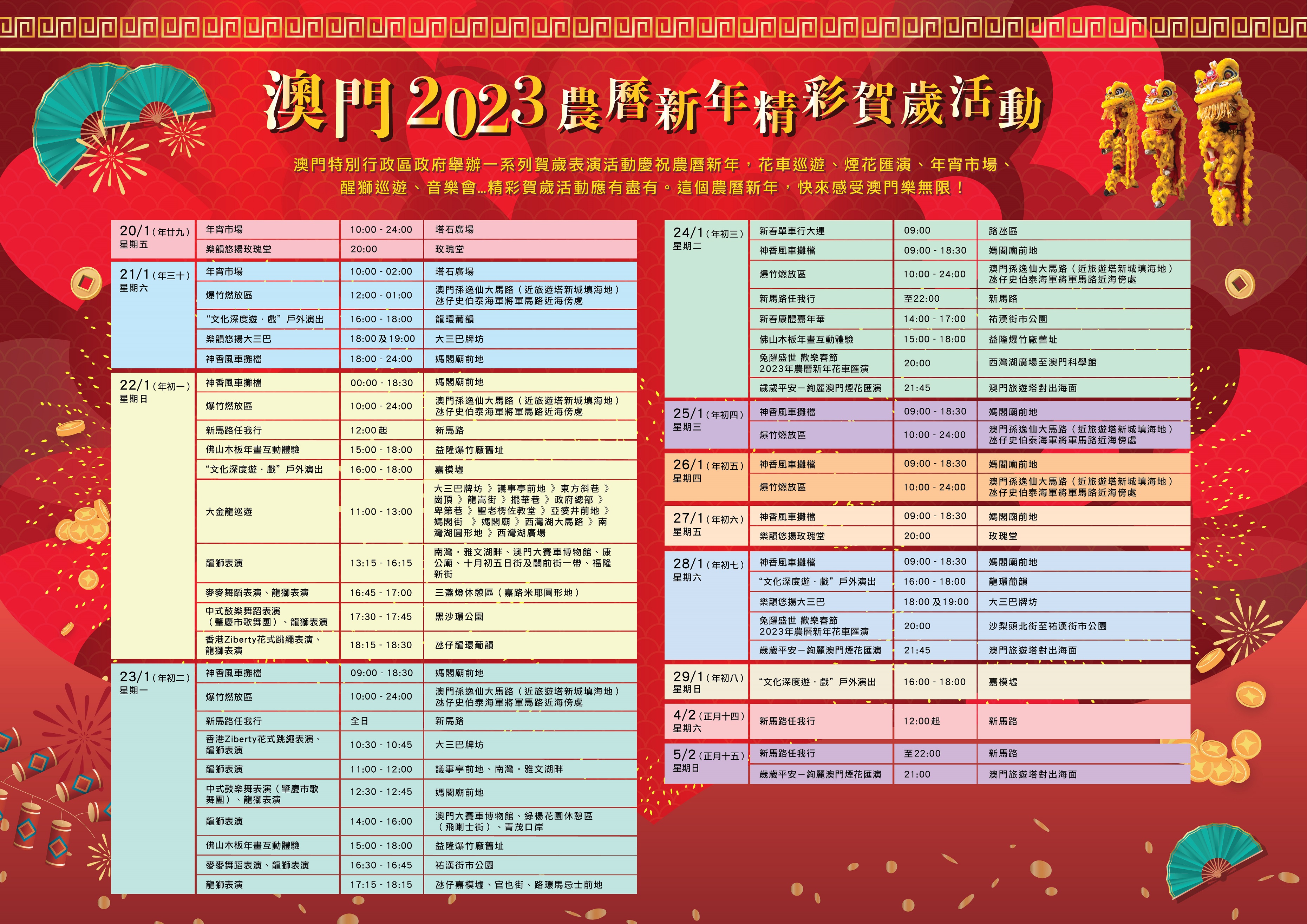 農曆新年期間,旅遊局將送上“龍騰舞躍賀新春”金龍巡遊、“兔躍盛世 歡樂春節2023年農曆新年花車匯演”、“歲歲平安—絢麗澳門煙花匯演”、花車展覽和線上遊戲等多項精彩活動,讓居民和旅客感受澳門農曆新年的節日氣氛,吸引旅客留宿消費,促進旅遊及相關行業復甦。