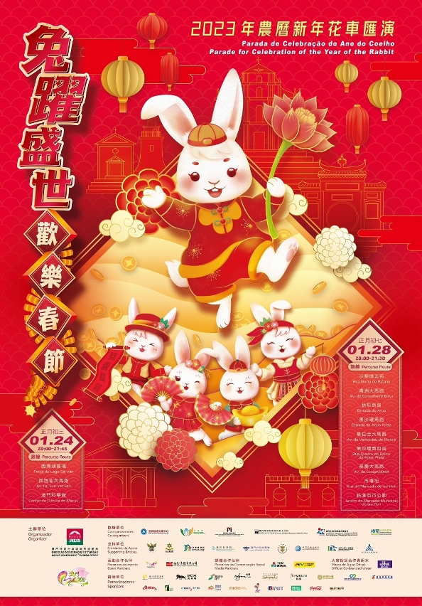 大型賀歲活動“兔躍盛世 歡樂春節2023年農曆新年花車匯演”以“兔年”為主題,透過兔子敏捷、聰明、活躍、幸運和熱愛挑戰的形象,傳達促進澳門產業多元發展及提振經濟活力、百業興旺的寓意。