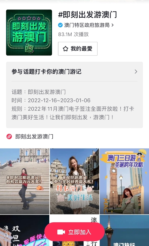 旅遊局針對內地客源市場,在微信、微博、抖音和小紅書等各官方線上平台持續宣傳。其中旅遊局抖音官方賬號發起話題“即刻出發遊澳門”,聚合抖音用戶和網紅創作的短視頻內容,增加澳門旅遊主題的網絡流量,進一步吸引更多內容創作者投入參與。標籤“即刻出發遊澳門”話題的影片由12月16日發起至今,累計超過8千3百萬次播放量,深受網民歡迎,提升遊澳意欲。