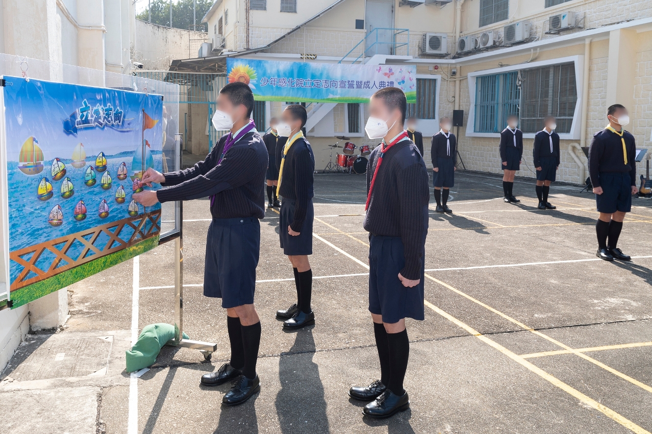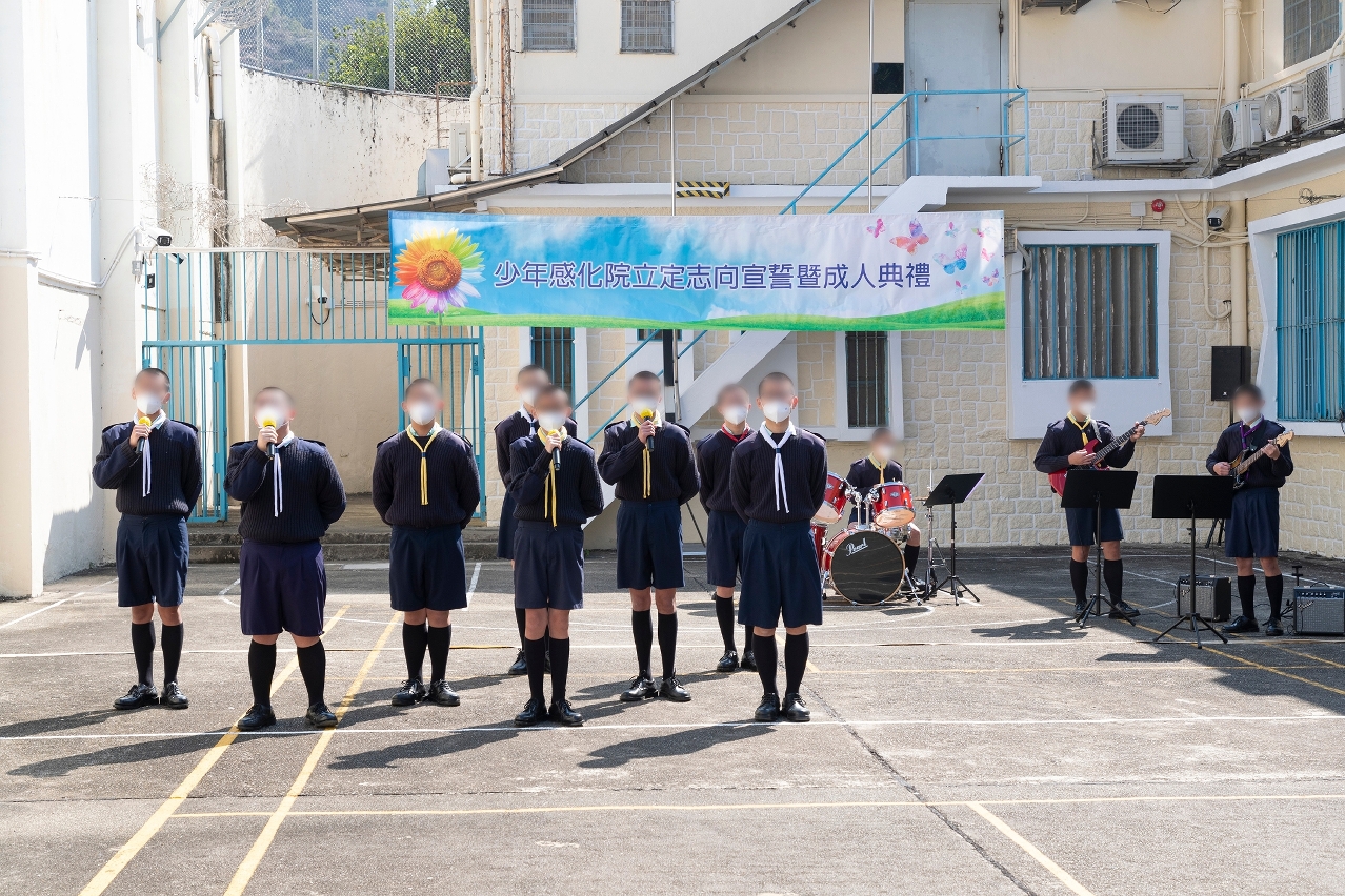 立志宣誓及成人禮由程况明局長及少年感化院余珮琳院長監誓,首先院生莊重地宣讀誓詞,並有序地張貼新一年的個人目標。隨後為一名剛年滿18歲的院生進行成人禮,該名院生鄭重地宣讀成人誓言,並分享了在感化院期間的成長和學習感悟,同時表達了對師長和感化院工作人員的感恩之情,以及對未來理想的追求。最後,儀式在院生精彩的音樂表演中,圓滿結束。
