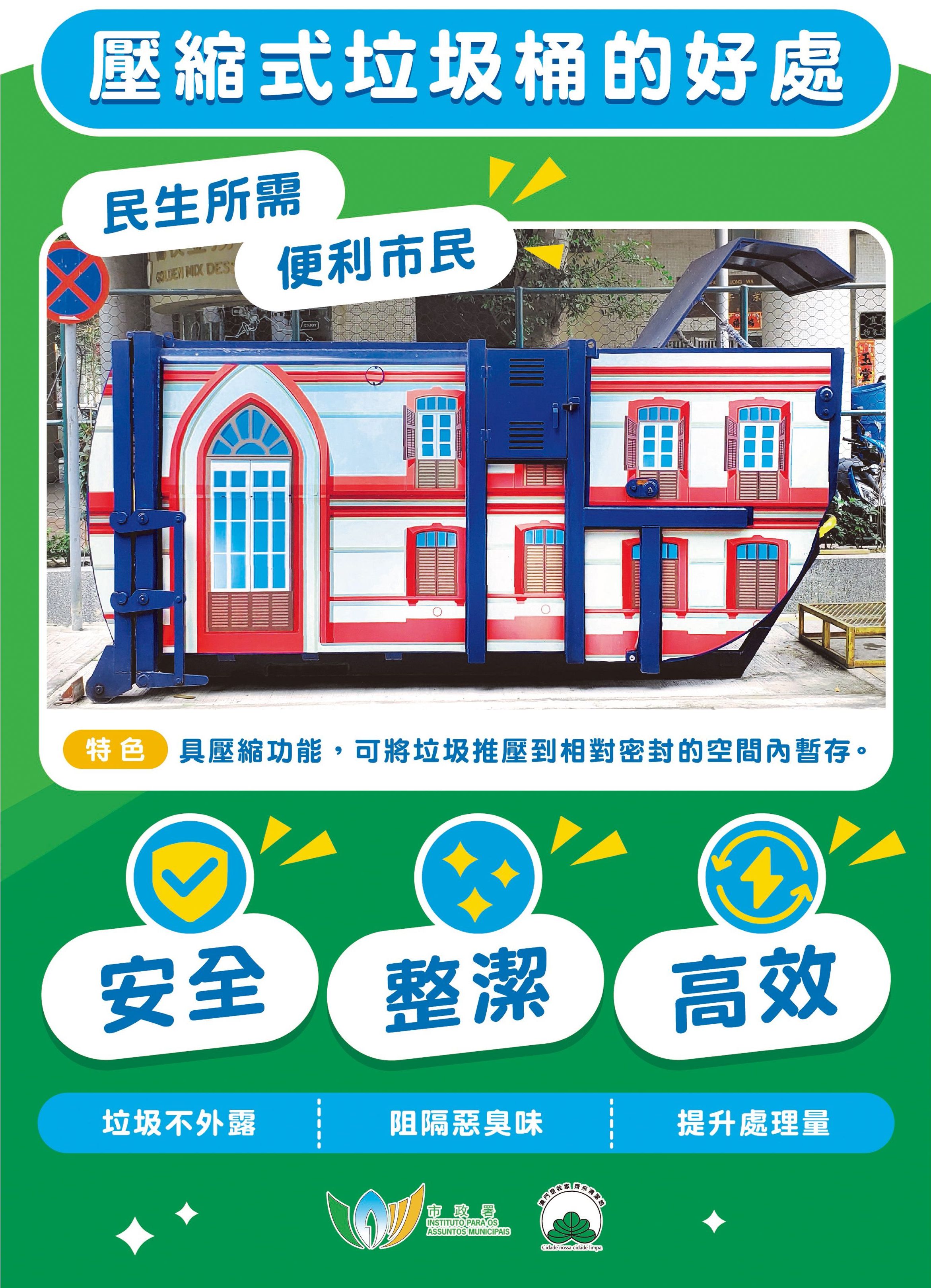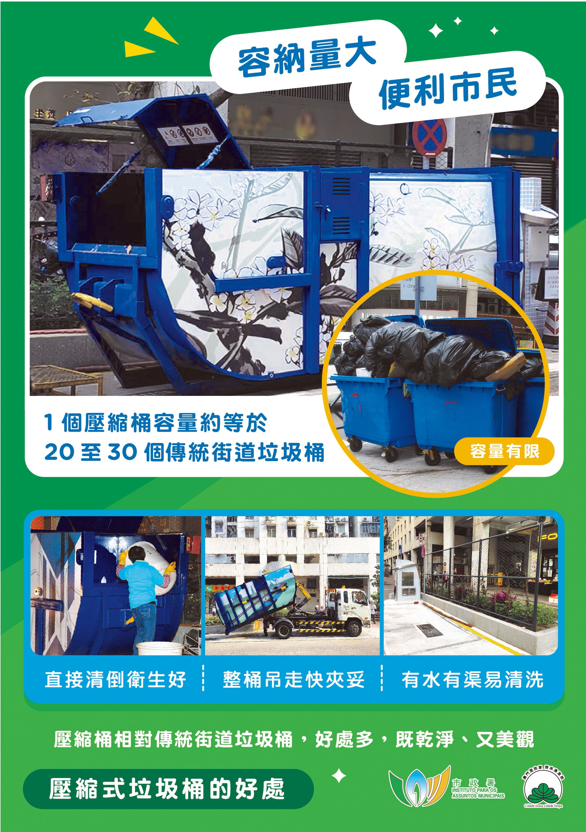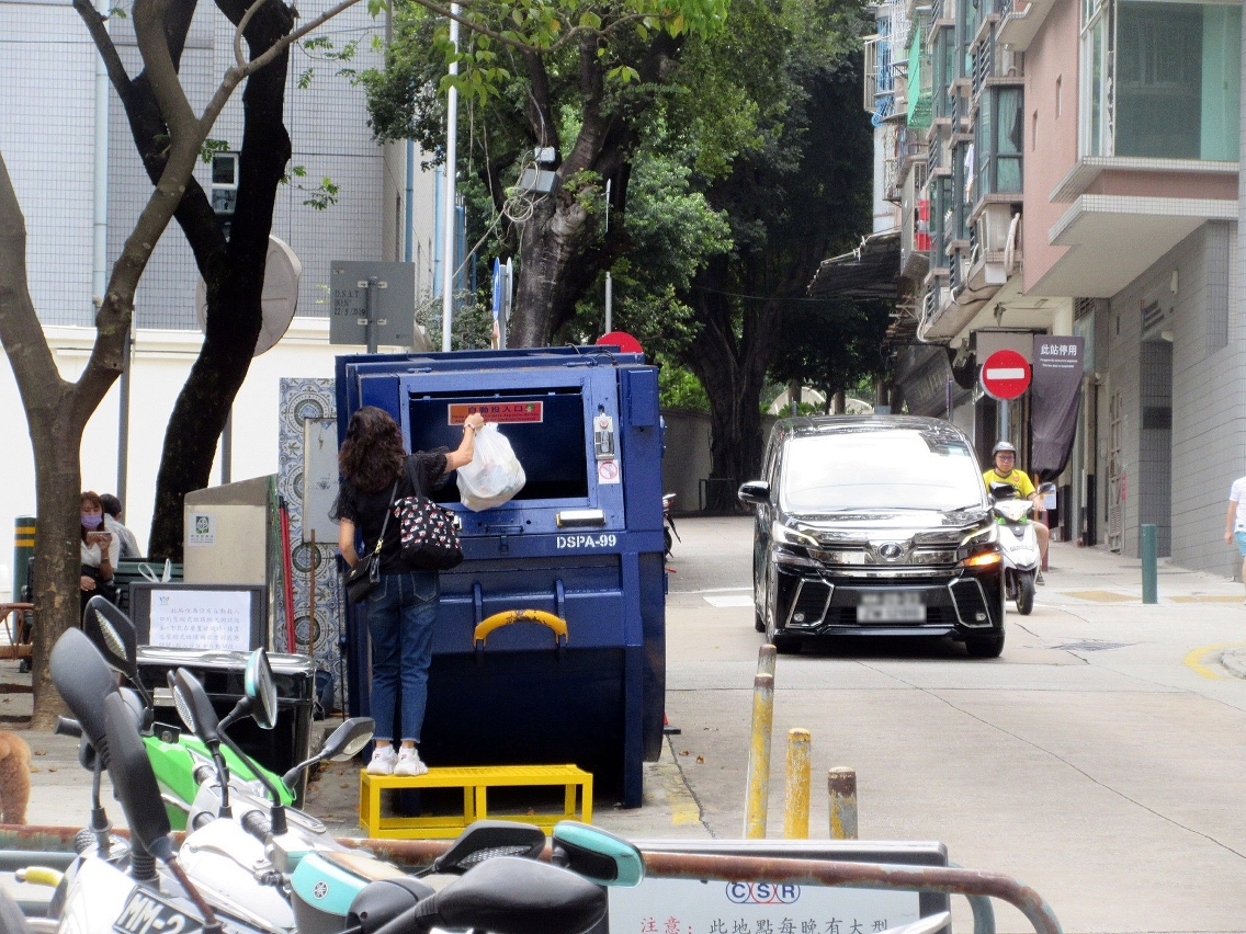 目前,全澳有壓縮式垃圾桶124個、封閉式垃圾房122個,傳統垃圾桶數量已由高峰期逾1,600個減少至104個,減幅逾9成。市政署未來將持續推動系列優化垃圾收集措施,包括:在壓縮式垃圾桶增設自動投入口,提升密封性及便利性;受環境空間所限,未具條件設置壓縮式垃圾桶或封閉式垃圾房的垃圾站,加設覆蓋外箱,外箱上蓋以液壓裝置牽引,居民輕踩腳踏即開啓上蓋,棄置垃圾後,上蓋自動關閉,減少臭味飄散和揚塵,避免垃圾外露;增加壓縮式垃圾桶、垃圾房的飾面美化和綠化。