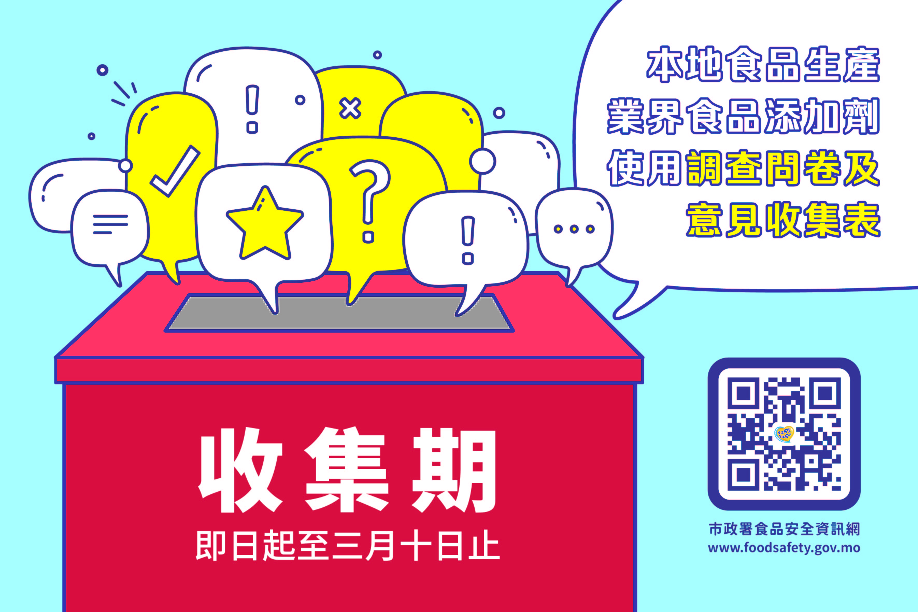 另外,為方便更多業界發表意見,市政署已於食品安全資訊網 www.foodsafety.gov.mo上載《食品添加劑使用調查問卷及意見收集表》,下載及填妥後可電郵至fsconsult@iam.gov.mo或傳真至8296 1204提交,收集期由即日起至三月十日,歡迎業界踴躍發表意見。