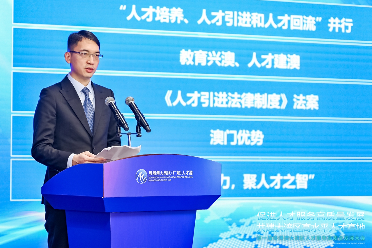 周昶行秘書長於大會高峰論壇上介紹澳門特區政府推進人才培養、人才引進的工作情況,並重點介紹了澳門吸引人才的優勢,包括社會治理、社會保障、教育制度、稅務優惠等方面内容,期望深化粵港澳三地的人才工作交流合作,進一步提升大灣區的國際競爭力、打造世界一流城市群。