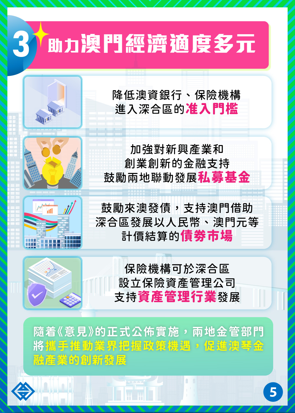 金管局與深合區金融發展局已建立跨境金融工作組,雙方就債券市場、私募基金、融資租賃,以及在深合區建立粵港澳大灣區保險服務中心等議題保持溝通。隨着《意見》的正式公佈實施,兩地金融部門將攜手推動業界用好中央給予的支持政策,促進澳琴金融產業的聯動創新發展。