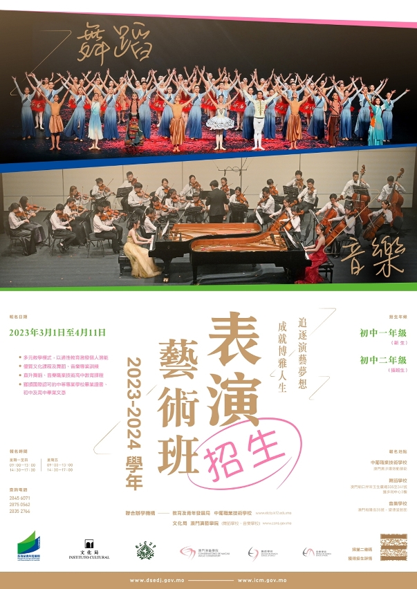 由教育及青年發展局與文化局聯合開辦的表演藝術課程,招收2023/2024學年初一年級新生及初二年級插班生,即日起至4月11日接受報名。該課程由教青局轄下中葡職業技術學校聯合文化局轄下澳門演藝學院,整合資源優勢,協同培養澳門表演藝術人才。歡迎對舞蹈、音樂表演藝術有興趣的學生報讀。