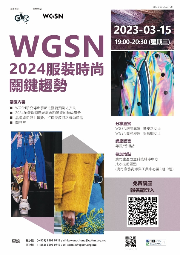 為讓本澳時尚及創意業界了解最新資訊及未來發展趨勢,澳門生產力暨科技轉移中心將於3月15日下午7時舉辦“WGSN-2024服裝時尚關鍵趨勢”講座,歡迎對本澳服裝行業發展有興趣的人士報名參加。