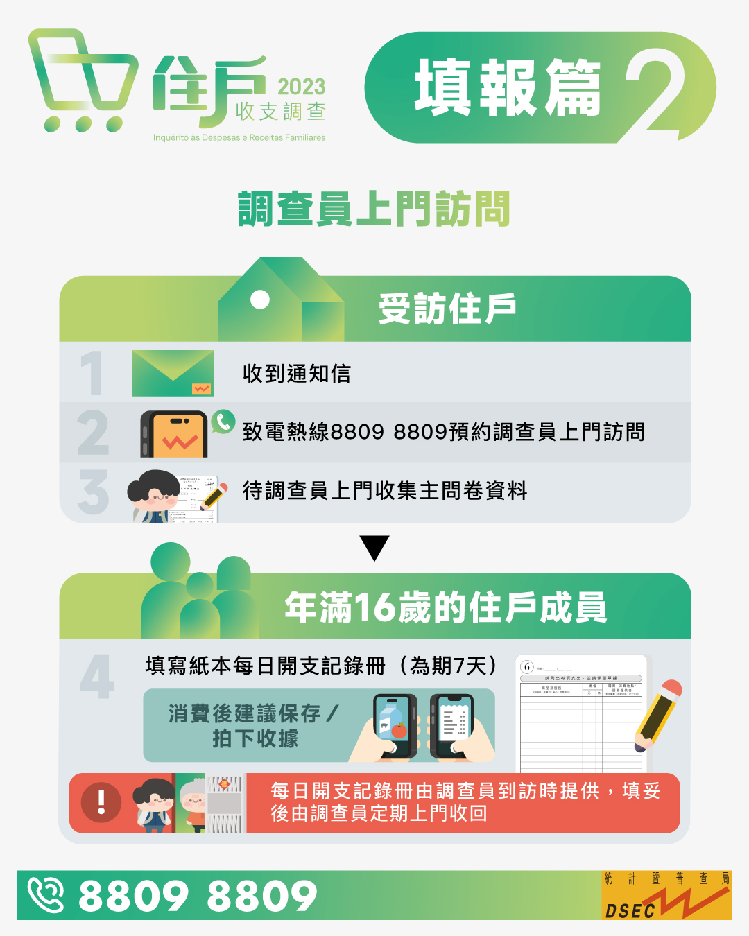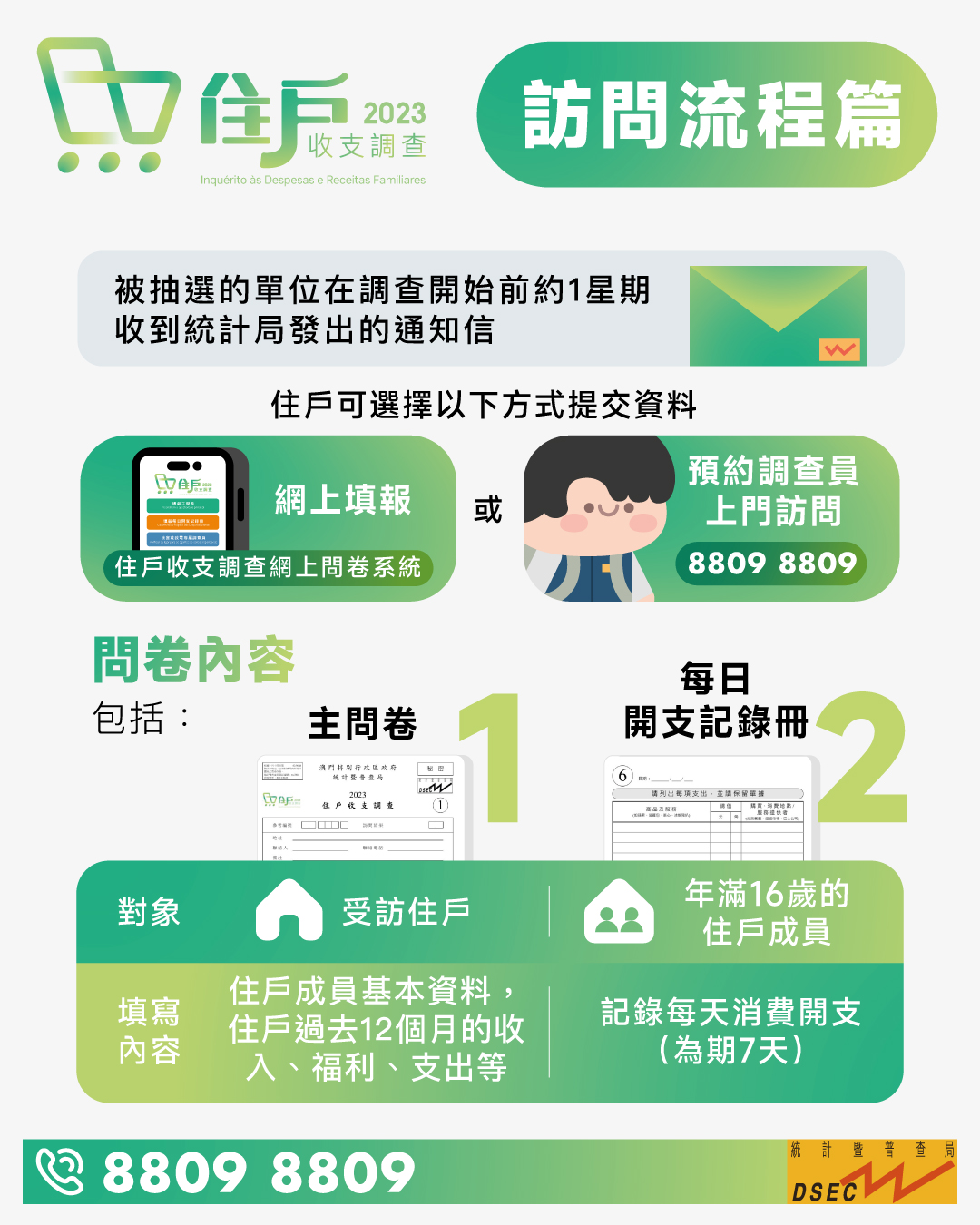 有關2023住戶收支調查的詳情,請瀏覽2023住戶收支調查專頁(https://www.dsec.gov.mo/IDRF2023),或致電熱線8809 8809查詢。