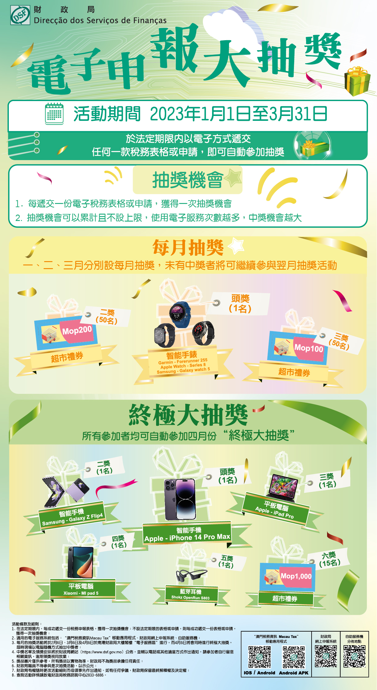 是次電子申報大抽奬已順利完成,得獎名單已上載至財政局網頁(https://www.dsf.gov.mo),以供查閱,並會以手機短訊形式通知得獎者領獎,請得奬者於5月5日前到南灣財政局大樓領取相關奬品。