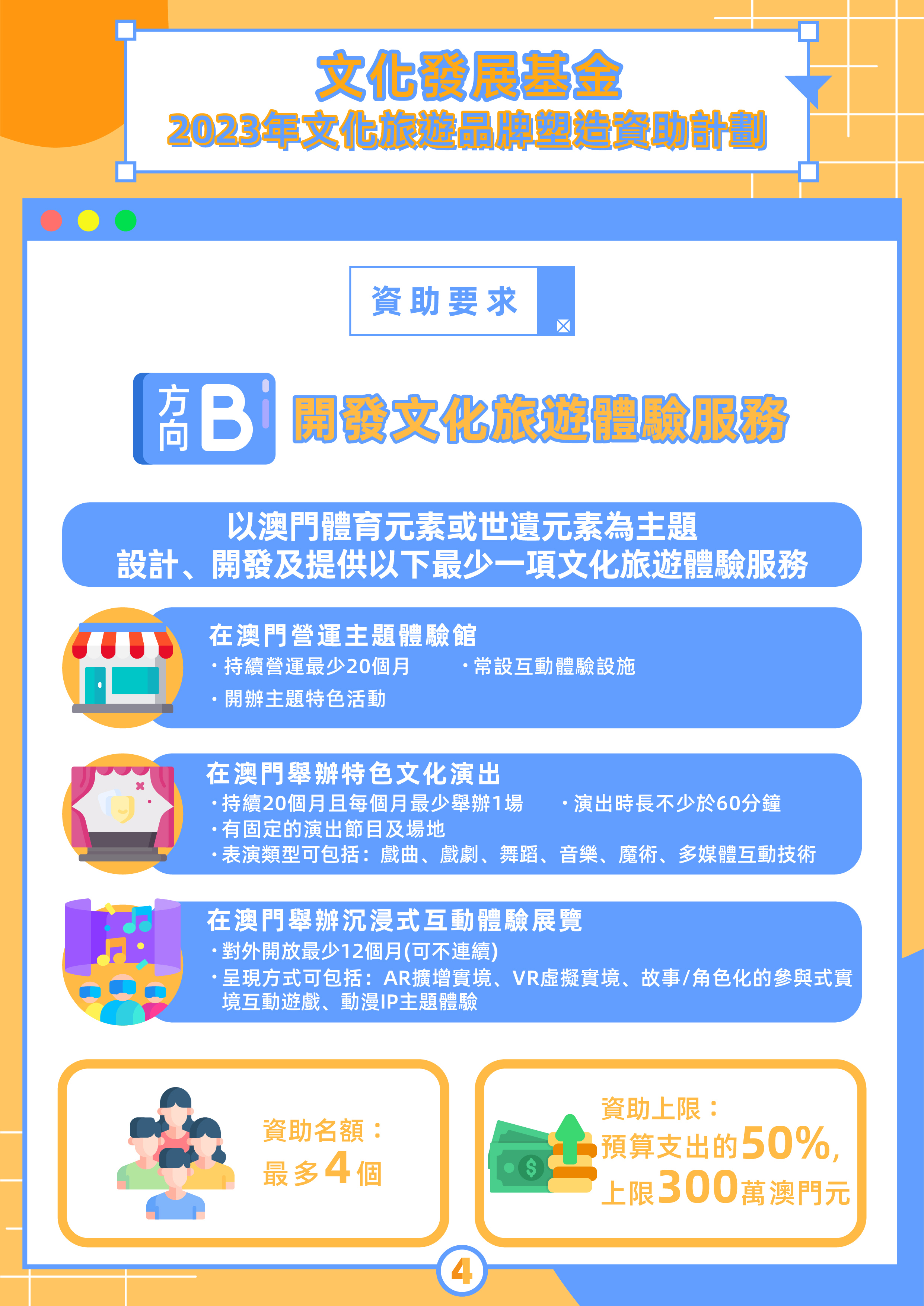 為推動文創與文化旅遊的跨界融合發展,基金將於4月17日至5月12日期間接受2023年“文化旅遊品牌塑造資助計劃”申請。資助計劃分為“開發文化旅遊產品”及“開發文化旅遊體驗服務”兩個方向,申請人須選定其中一個方向,以澳門的體育或世遺任一元素作為主題進行項目開發。資助計劃為補貼形式,名額方面,“開發文化旅遊產品”最多10個,“開發文化旅遊體驗服務”最多4個。