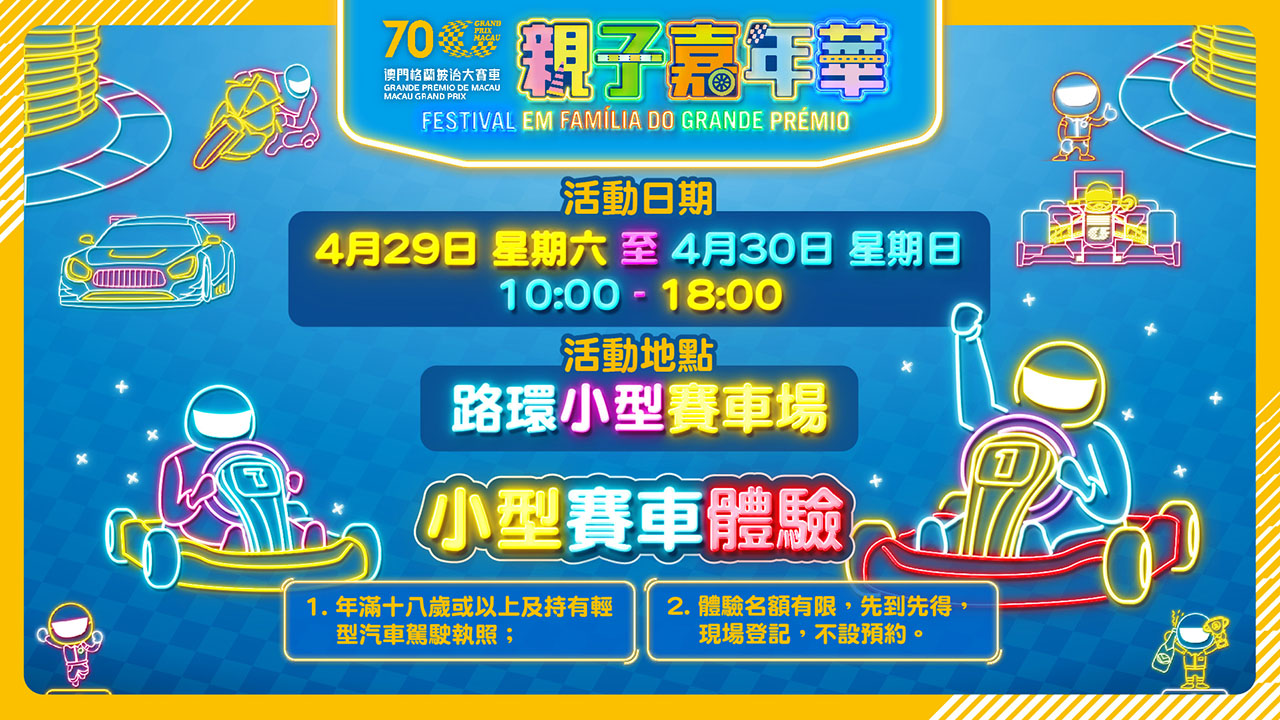 第70屆澳門格蘭披治大賽車將於本年11月舉行,為了讓廣大市民及旅客提前感受大賽車的氣氛, 第70屆澳門格蘭披治大賽車 - 親子嘉年華將於本年4月29日至30日,首次在路環小型賽車場舉行。