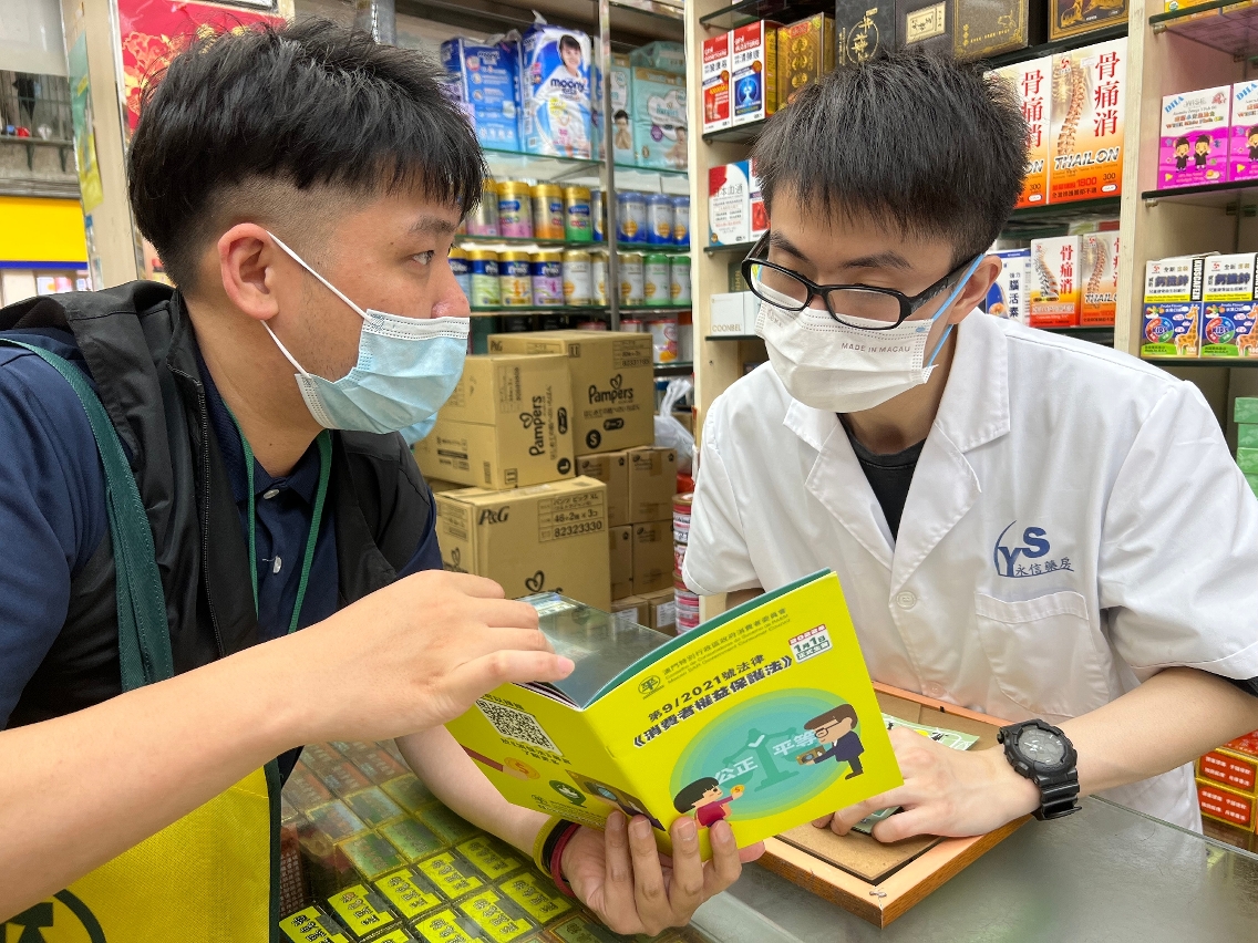 為保障消費者權益,維護澳門良好優質的消費環境,消委會與海關逢節假日前夕,到全澳各區開展普法工作,加強商戶知法守法意識。